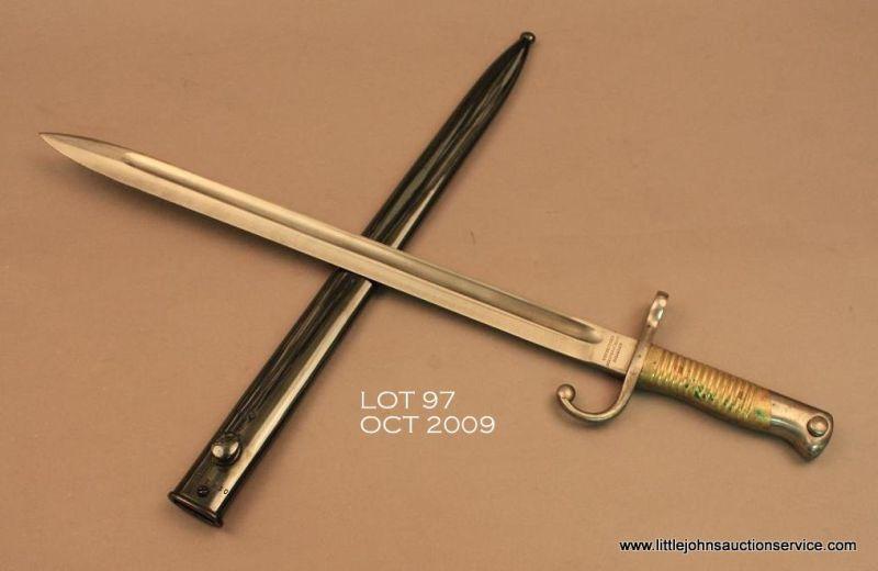 Argentine Mauser bayonet and scabbard, #C2930, in very good condition. Scabbard is in good condition as re-blued, also marked C2930. Est. $50-$100.