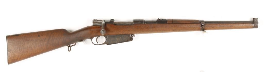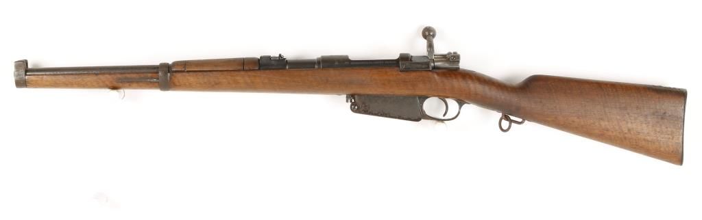 Argentine military bolt action carbine with 17.6" barrel. Full length straight grip wood stock, shrouded front sight. In original configuration. Crest still visible on top of receiver. Left side of receiver marked "MANUFACTURE LOEWE BERLIN" Good bore and action. Condition: Fair to good showing moderate pitting throughout and wood is good. *Antique Firearm*