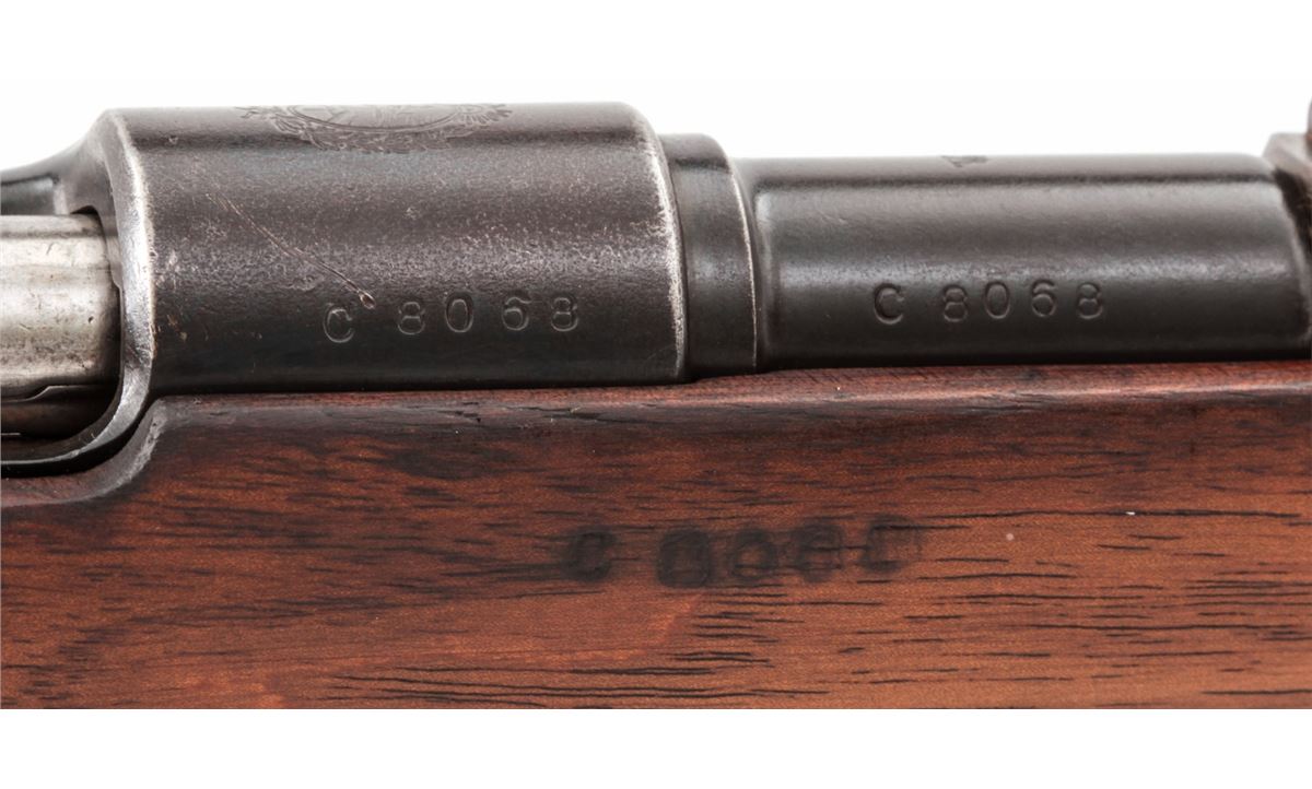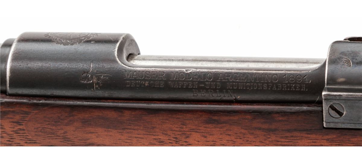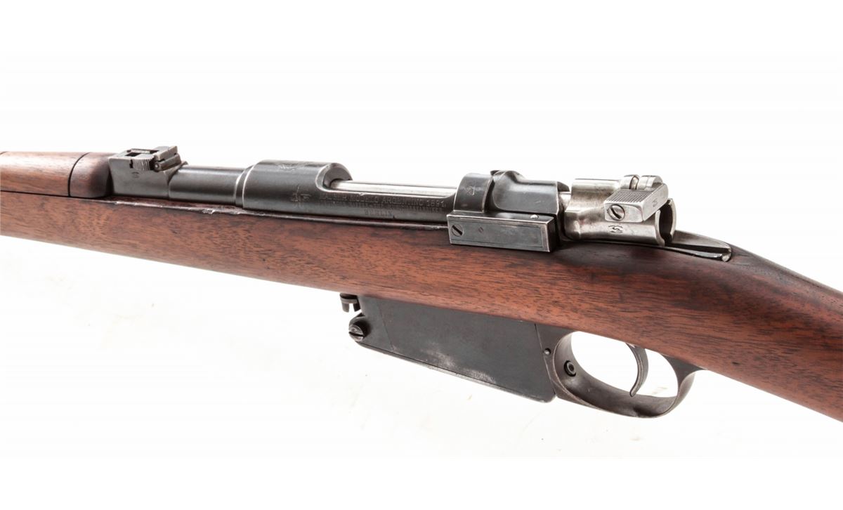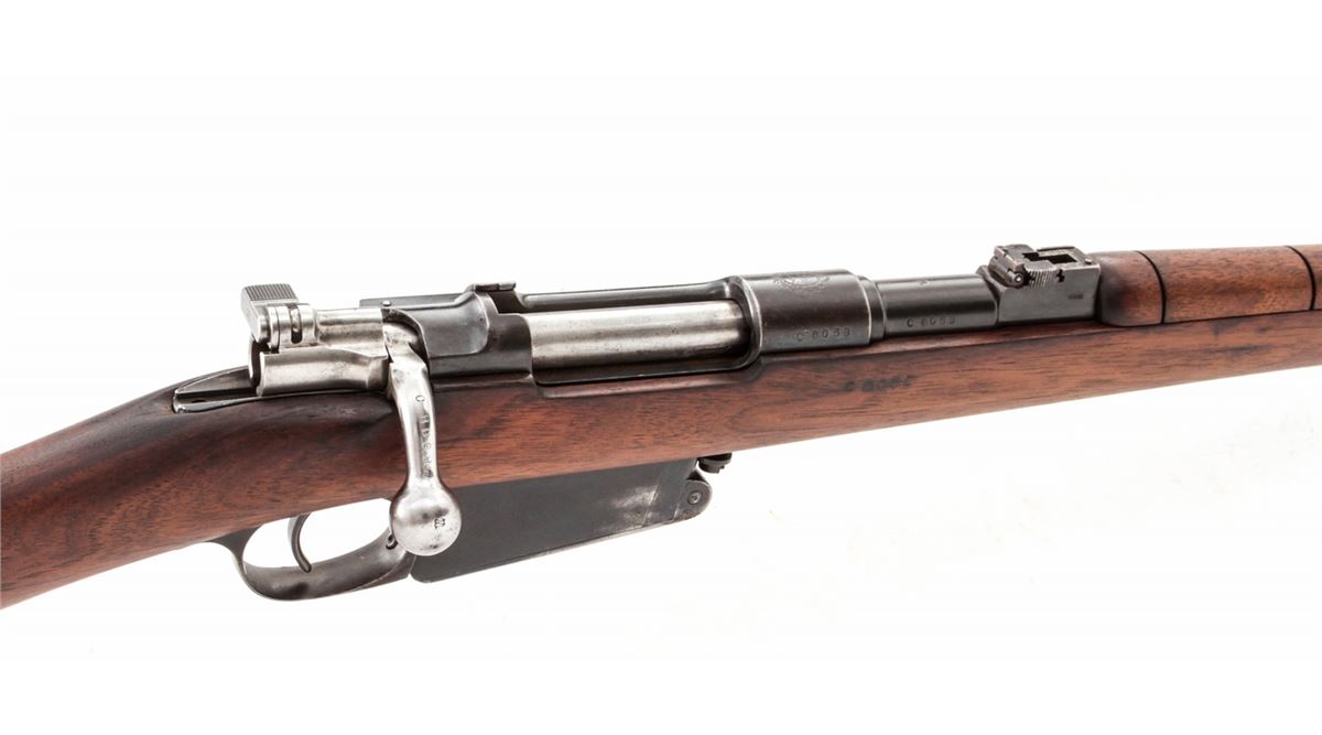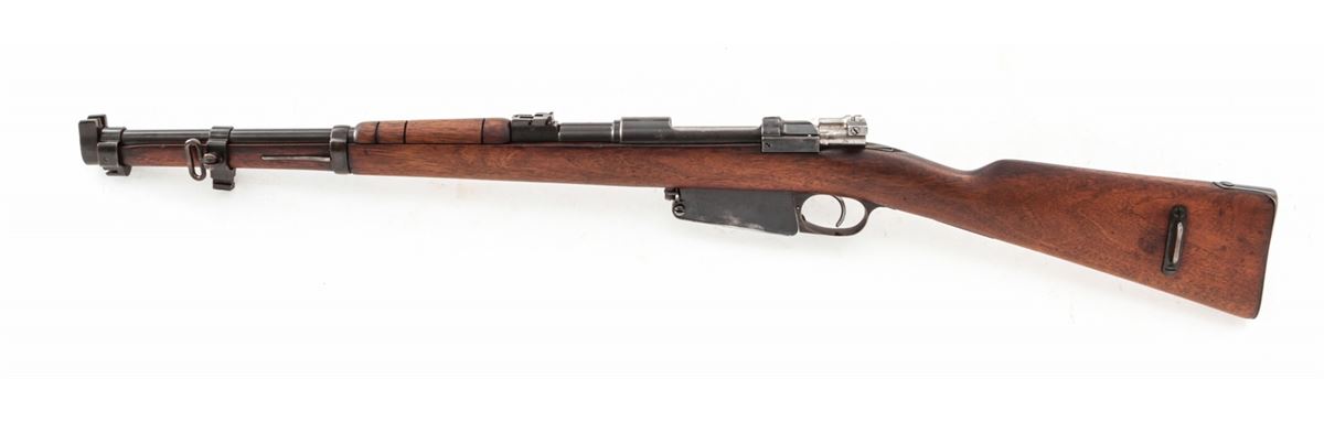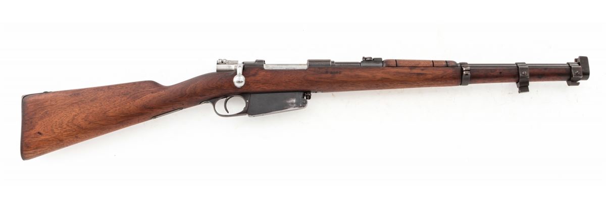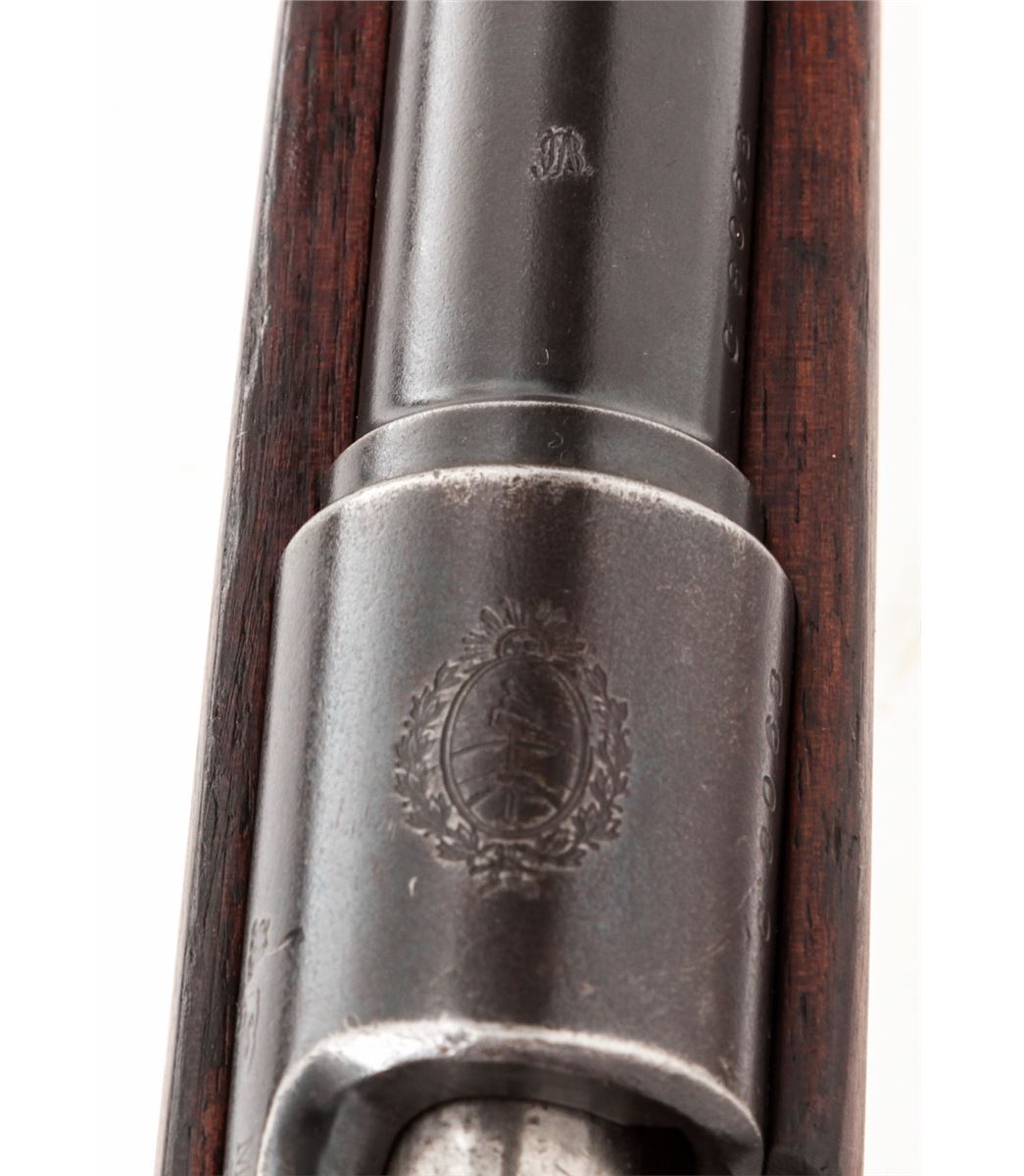 Argentine Model 1891 Engineer's Carbine, by DWM, #C8068, 7.65x53mm, 17.6'' barrel, blue finish, walnut stock, with bayonet lug and sling swivel to left cheekpiece area. Condition is very good to fine with good crest and 85%-90% arsenal blue. All visible matching numbers. Stock with general smoothing and some oil darkening. Good action, fair bore. No import marks visible. Est.: $250-$450. (C&R)