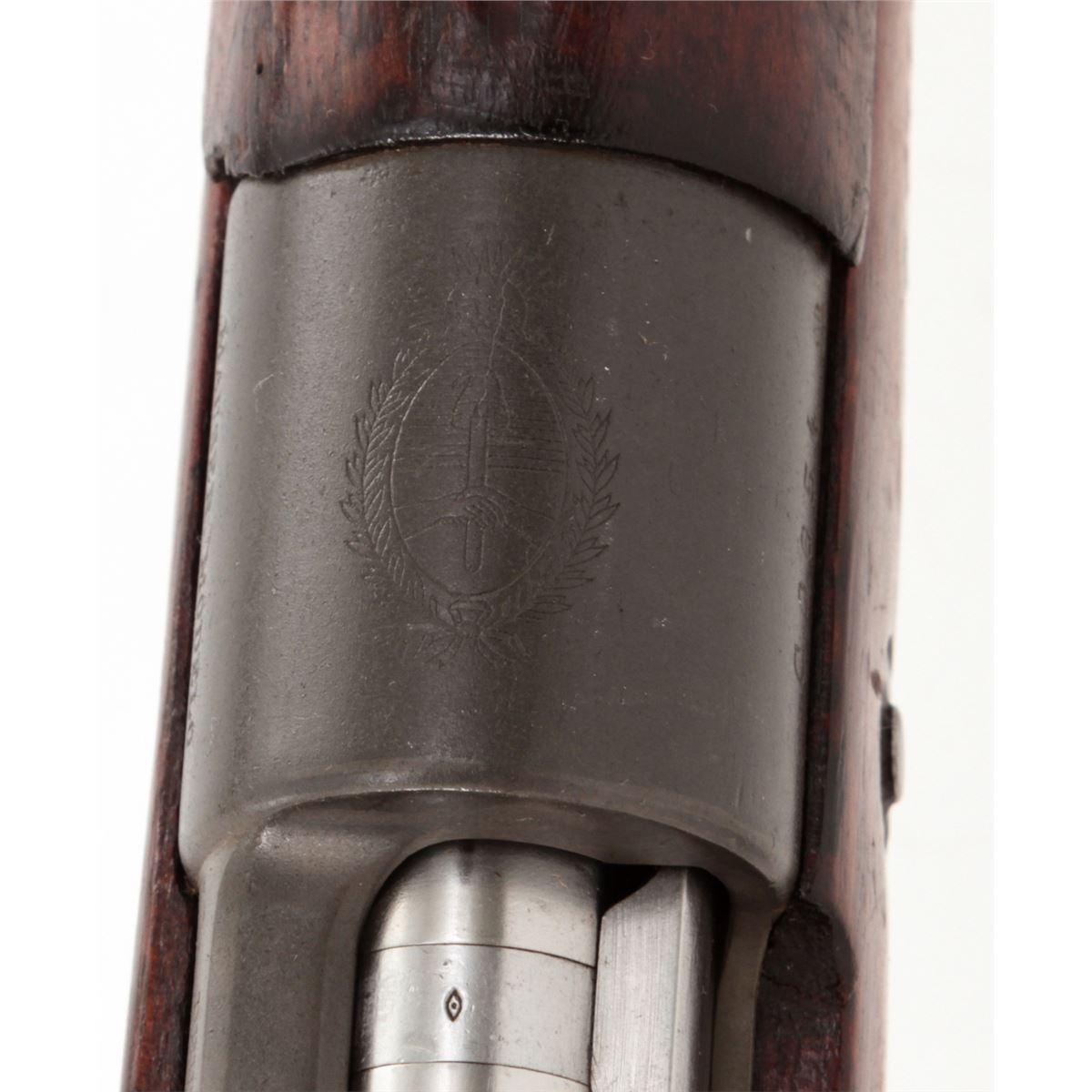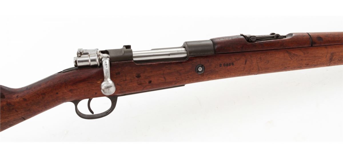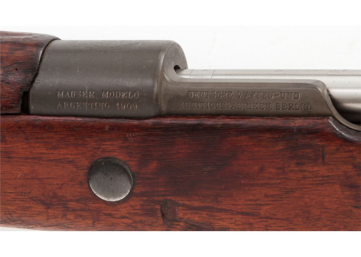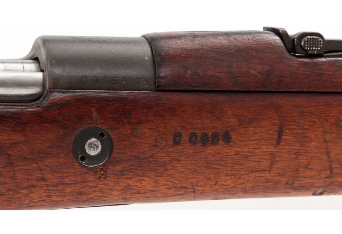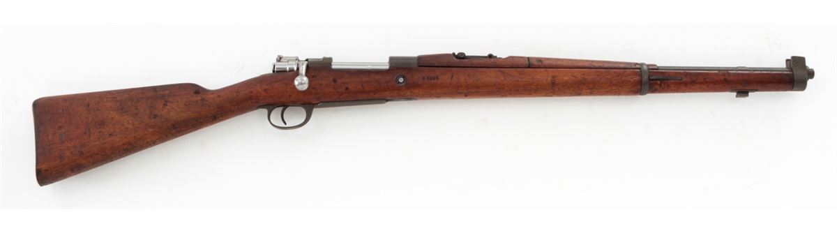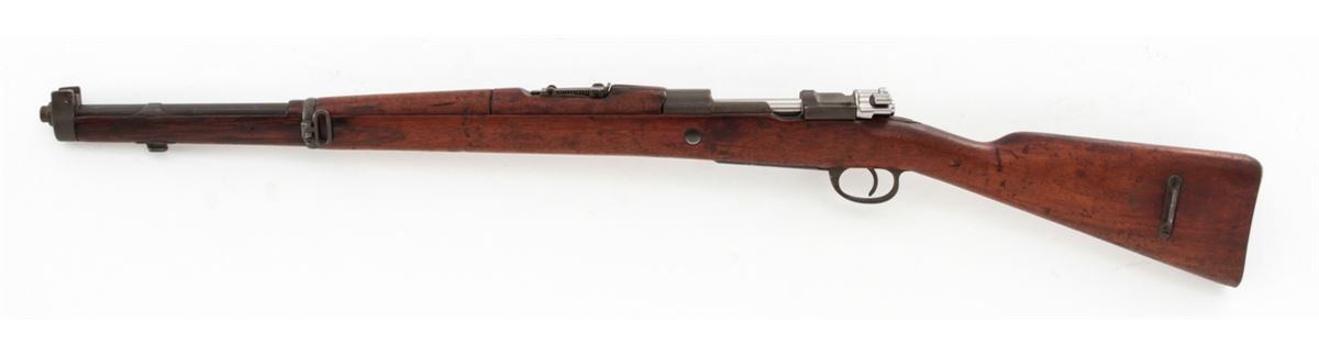 Argentine Model 1909 Bolt Action Carbine, by DWM, #CO654, 7.65x53 cal., phosphate finish, matching bright polished bolt, with matching European walnut stock. Condition is very good to fine as arsenal overhauled and lightly import marked, retaining approx. 92% finish. Stock with nicks, scuffs and oil staining. Action is good, bore is good. Est.: $250-$450. (C&R)