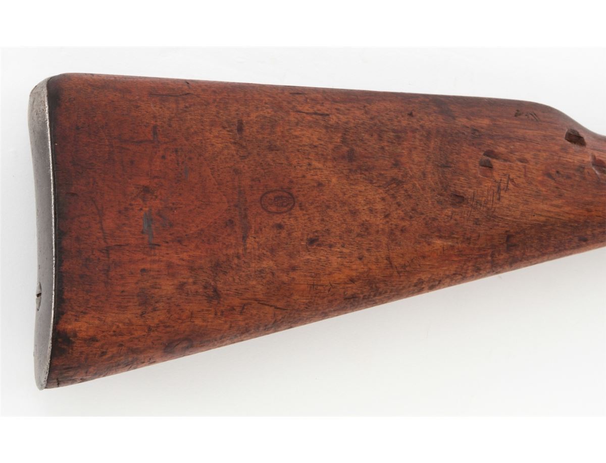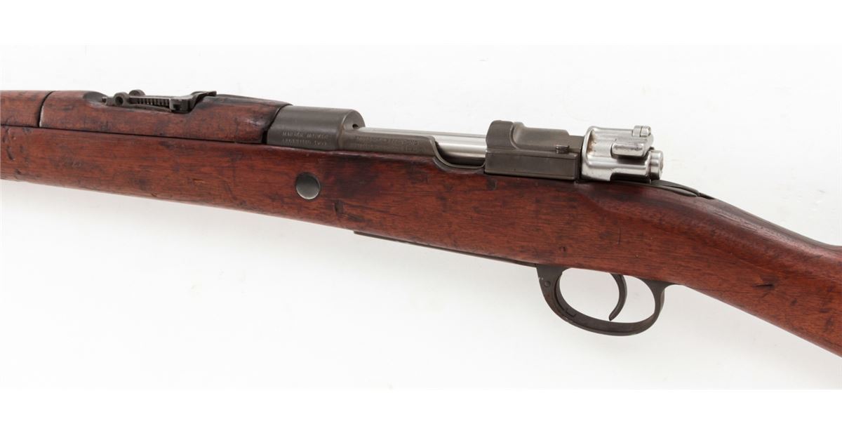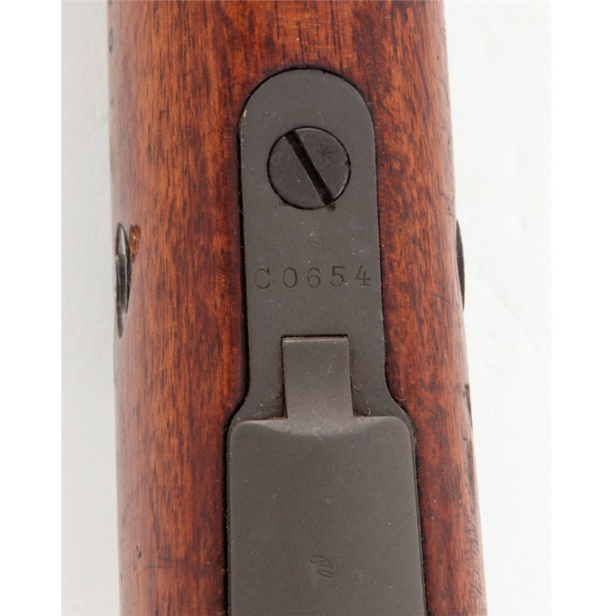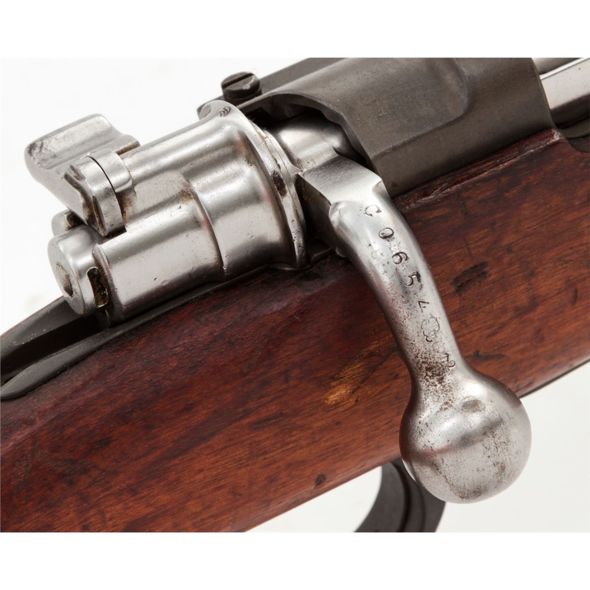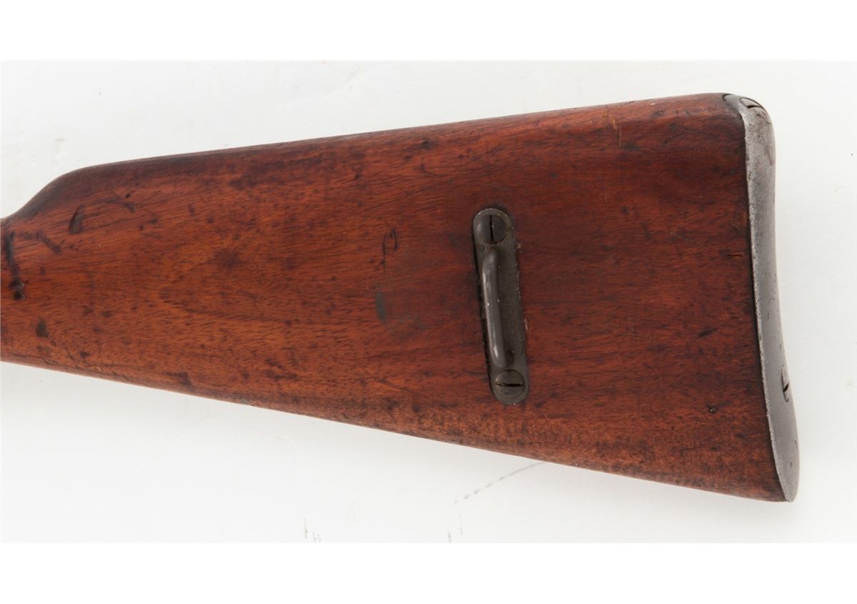 Argentine Model 1909 Bolt Action Carbine, by DWM, #CO654, 7.65x53 cal., phosphate finish, matching bright polished bolt, with matching European walnut stock. Condition is very good to fine as arsenal overhauled and lightly import marked, retaining approx. 92% finish. Stock with nicks, scuffs and oil staining. Action is good, bore is good. Est.: $250-$450. (C&R)