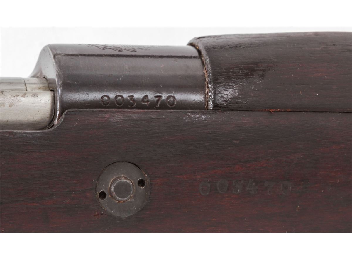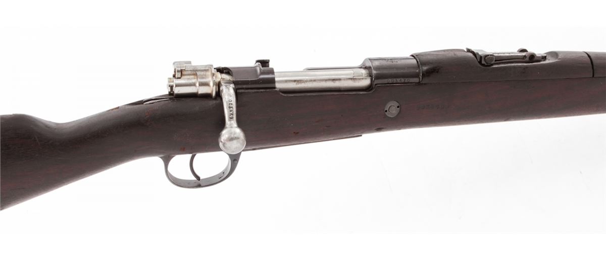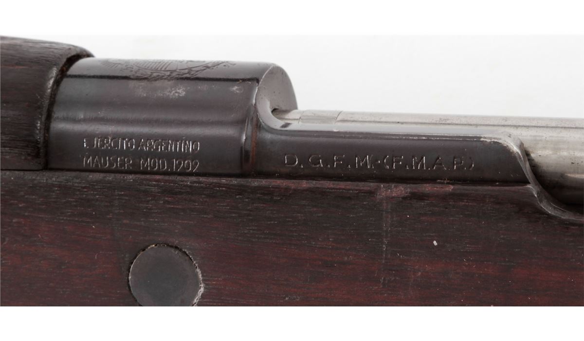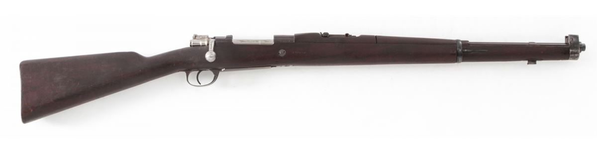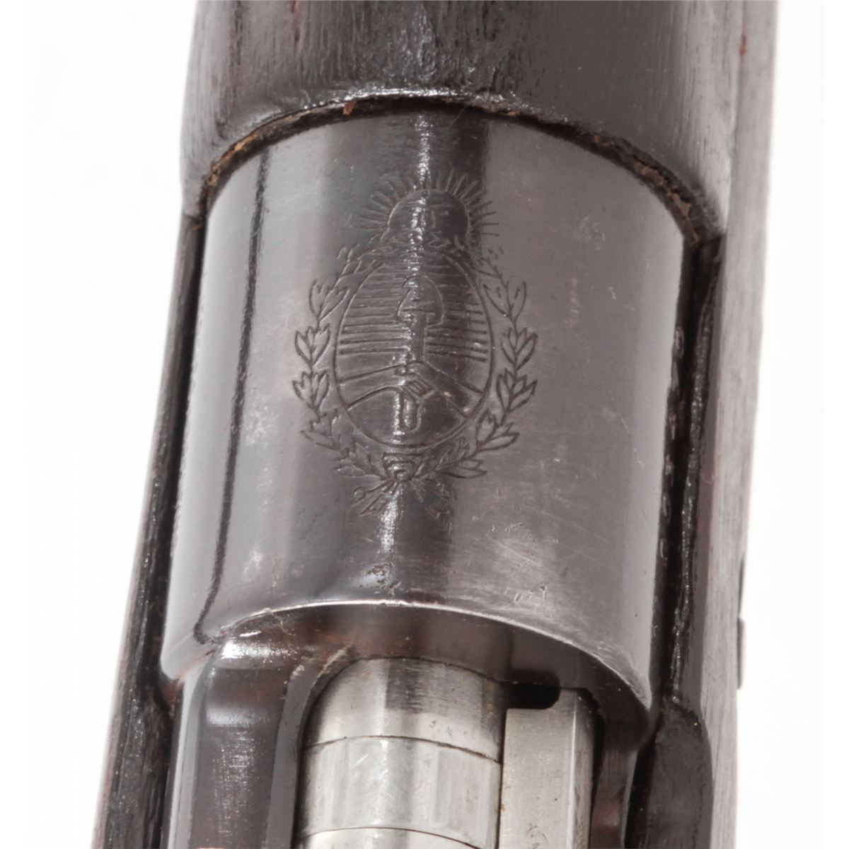 Argentine Model 1909 Bolt Action Cavalry Carbine, by DGFM, #003470, 7.65x53mm, 21-1/2'' barrel, blue finish, matching numbered full-length walnut stock, with Argentine crest to receiver ring. Bolt is one number different. Condition is fine retaining approx. 95% arsenasl finish. Stock with oil darkening and light to just moderate impressions. Action is crisp, counter-bored barrel is very good to near fine. Lightly import marked to top of barrel. Est.: $400-$600. (C&R)