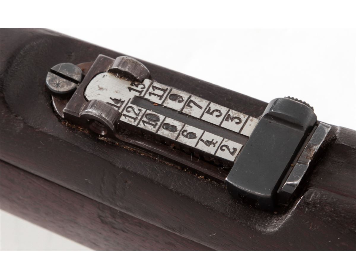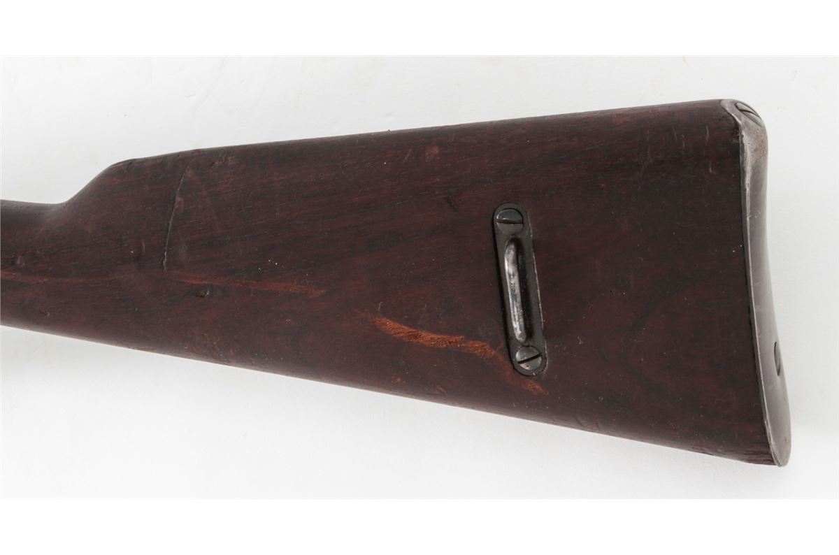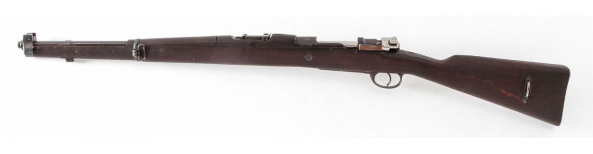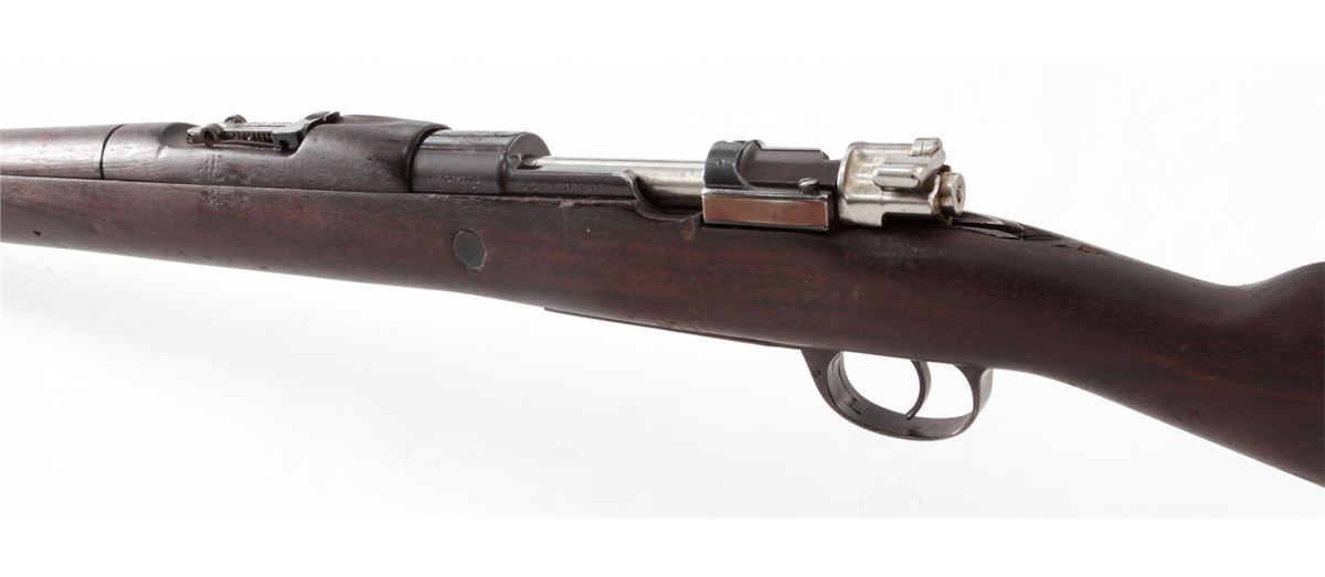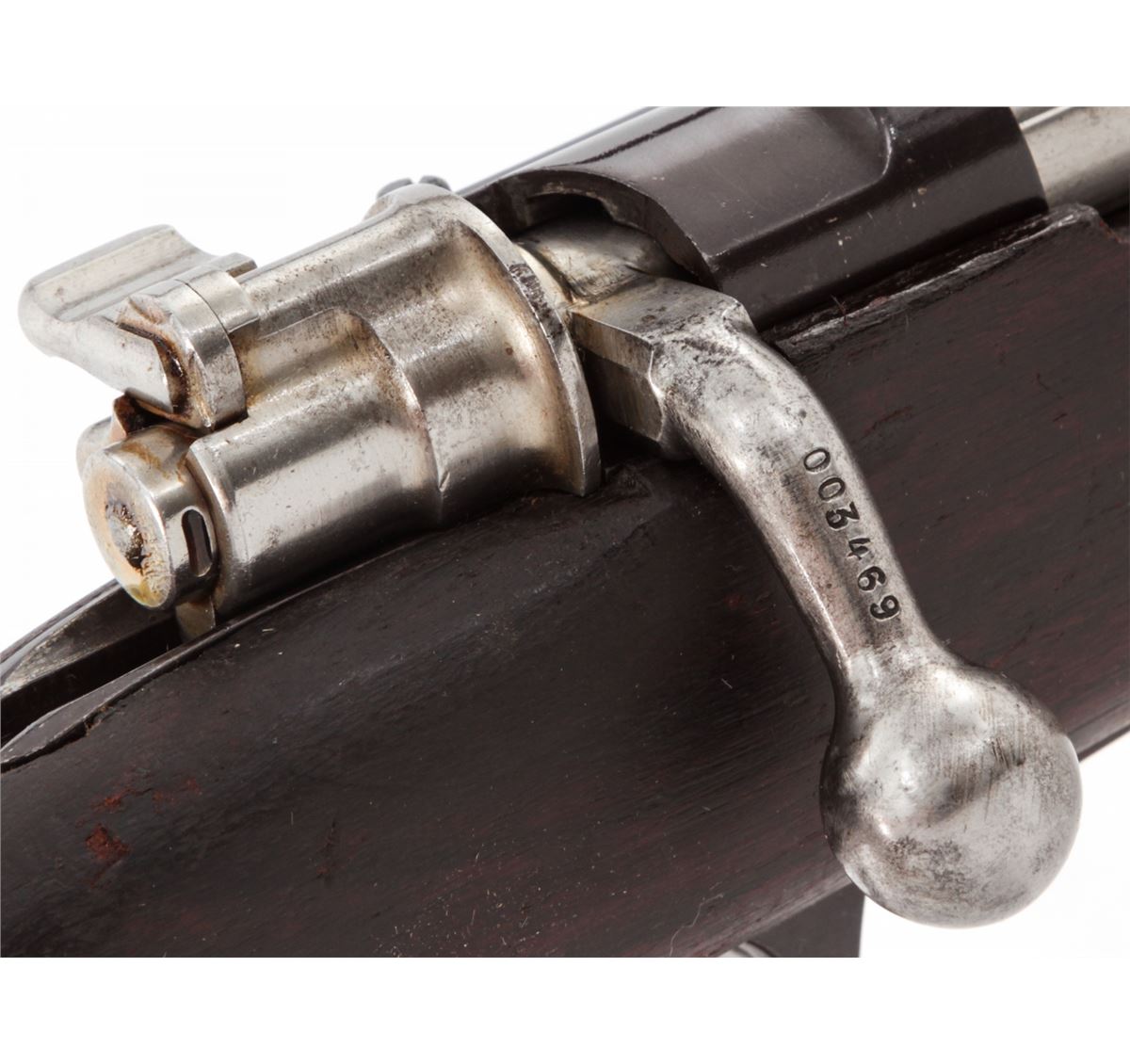 Argentine Model 1909 Bolt Action Cavalry Carbine, by DGFM, #003470, 7.65x53mm, 21-1/2'' barrel, blue finish, matching numbered full-length walnut stock, with Argentine crest to receiver ring. Bolt is one number different. Condition is fine retaining approx. 95% arsenasl finish. Stock with oil darkening and light to just moderate impressions. Action is crisp, counter-bored barrel is very good to near fine. Lightly import marked to top of barrel. Est.: $400-$600. (C&R)