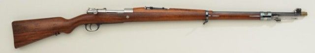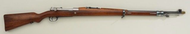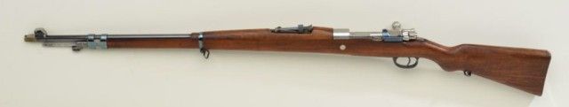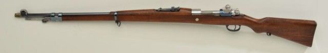 Argentine Model 1909 bolt action Military full length rifle and 7.65 caliber, serial #B1515 in fine to excellent original condition with pre 1968 importers information tag attached and no importers marks. 95-98% original bright blue, bright finish on bolt and action which is uncleaned. The stock shows a deep cartouche and is near excellent. The rifle retains a original matching serial numbered cleaning rod and muzzlecover. A 9.8 on 1-10 scale that was especially selected for the biggest collector and gun magazine publisher of his time. Robert E. Petersen collection. Est.; $600-$1,200.