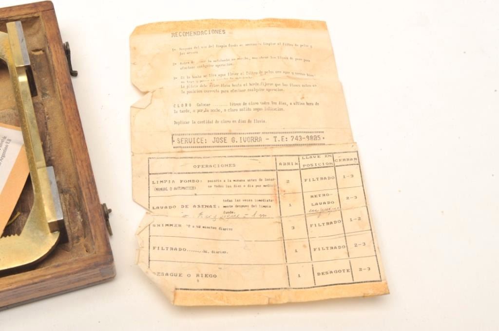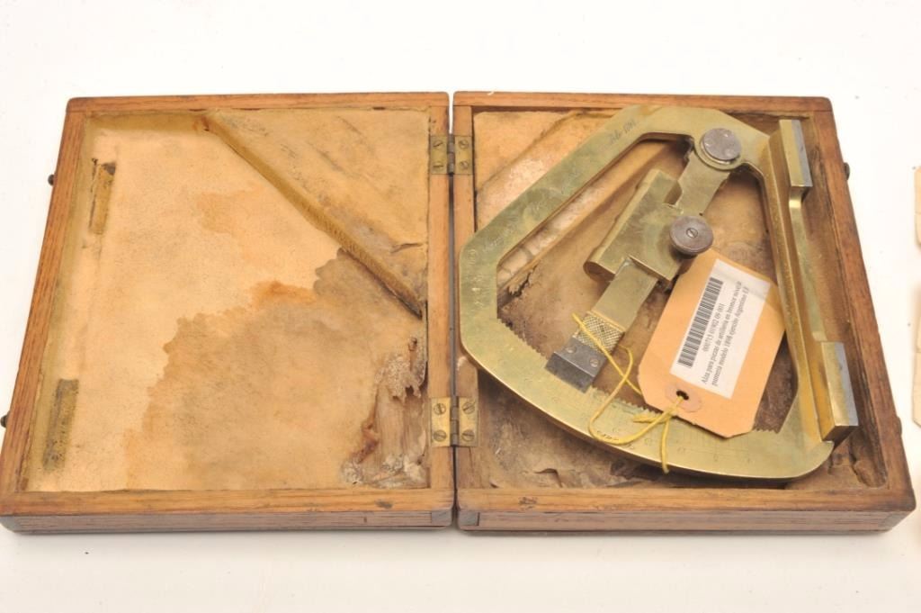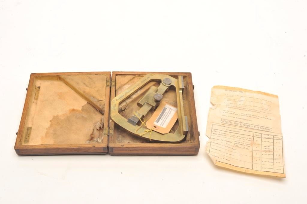 Argentine military sighting instrument for artillery M1898 in original box with instruction sheet. Precision made from brass and steel. Engraved calibrations. Measures approximately 5 ¾” x 6 ½” instrument only.The condition is almost fine with stenciled markings in Spanish on top of case. Est.: $200-400