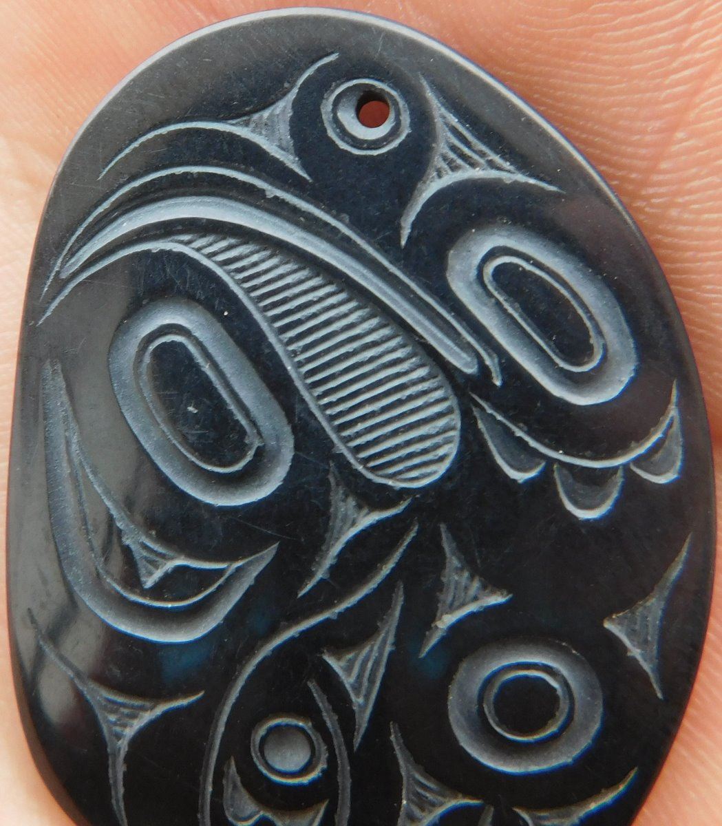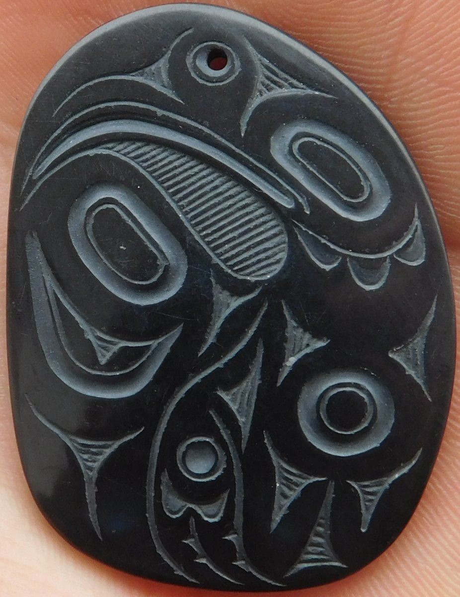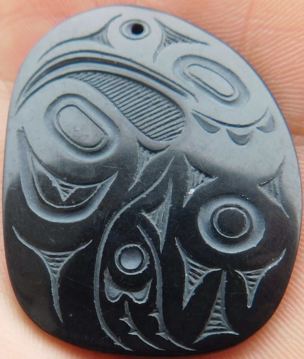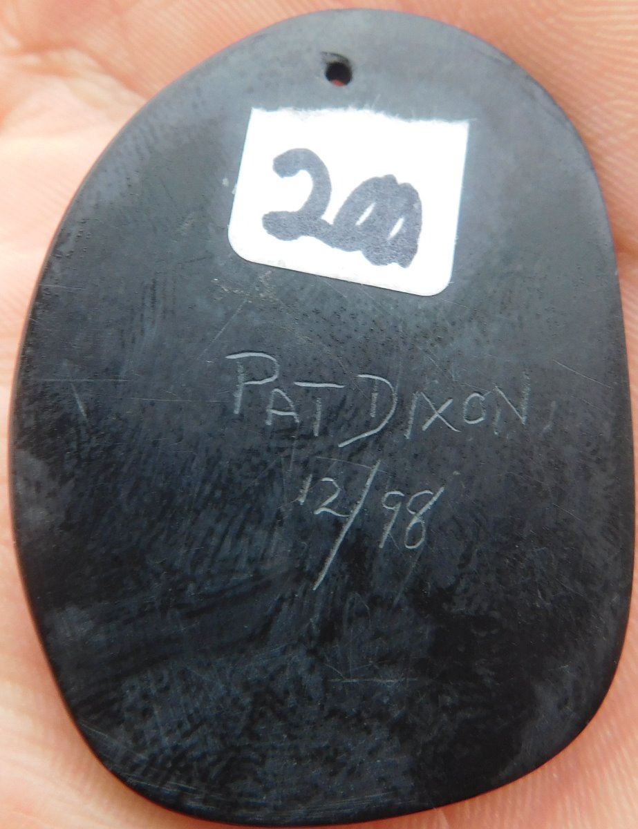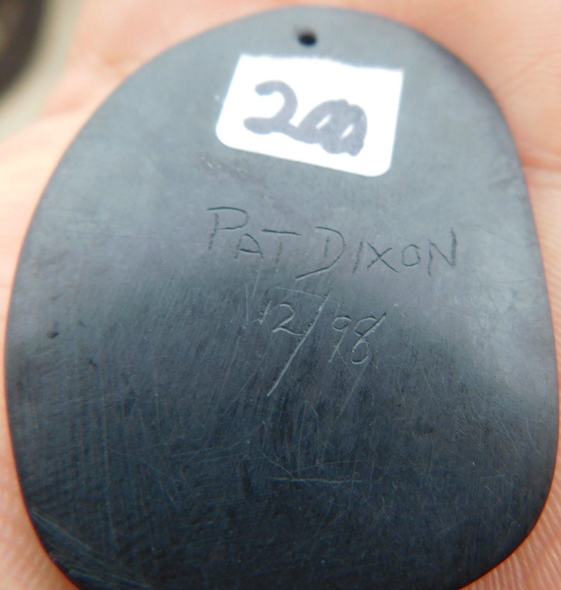Argillite NWC Pendant, 1998. Made of argillite, the item is 1.75" x 1.5". Pat Dixon. Great polish and fine carving on this pendant. Appears to have one or two animal effigies. Condition: Very good, see images. Shipping: $12.50 w/insurance and signature.