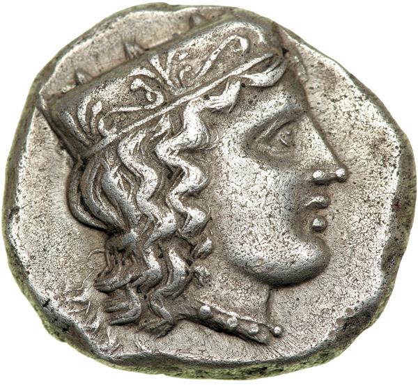 Argolis, Argos, c. 370-350 BC. AR Stater (12.02 g). Head right of Hera wearing necklace and stephane ornamented with palmettes. Reverse: Two dolphins swimming in opposing directions; between them, vine branch with grape cluster. Babelon (Traité III) 621; BMC 38. Reverse slightly double-struck. Extremely rare. Very Fine to Extremely Fine. .