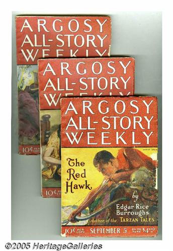 <B>Argosy-All Story Weekly Group (Munsey, 1925).</B></I> This is a nice group of consecutive issues which includes the entire three-part Edgar Rice Burroughs story, "The Red Hawk." The group contains the following issues: Sept. 5, 1925 (GD); Sept. 12, 1925 (GD); and Sept. 19, 1925 (VG). The September 5 issue has a Modest Stein cover, depicting Tarzan with a bow and arrow atop a cliff. All three pulps have excellent page quality. The Ultimate Guide to the Pulps VG value for group = $160.