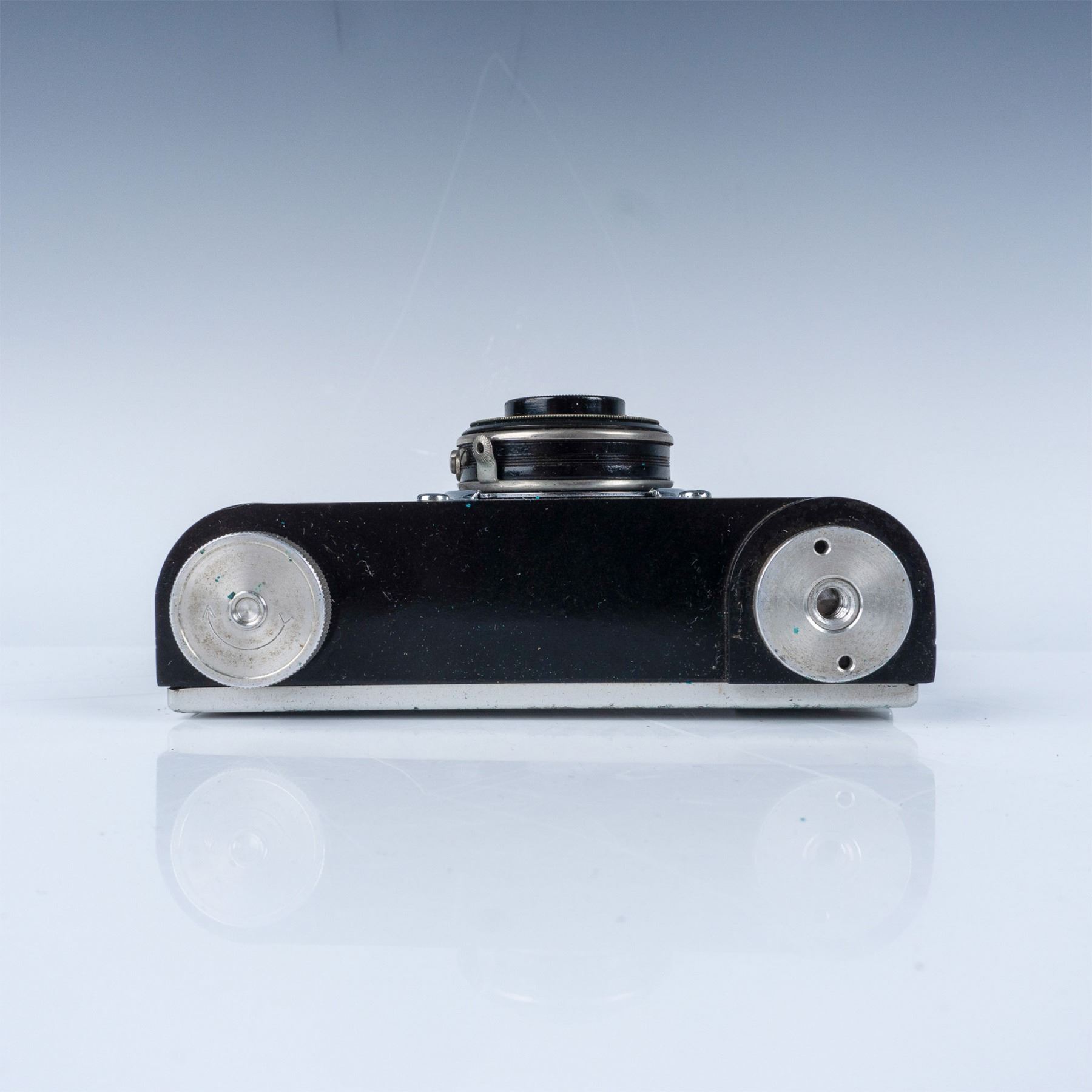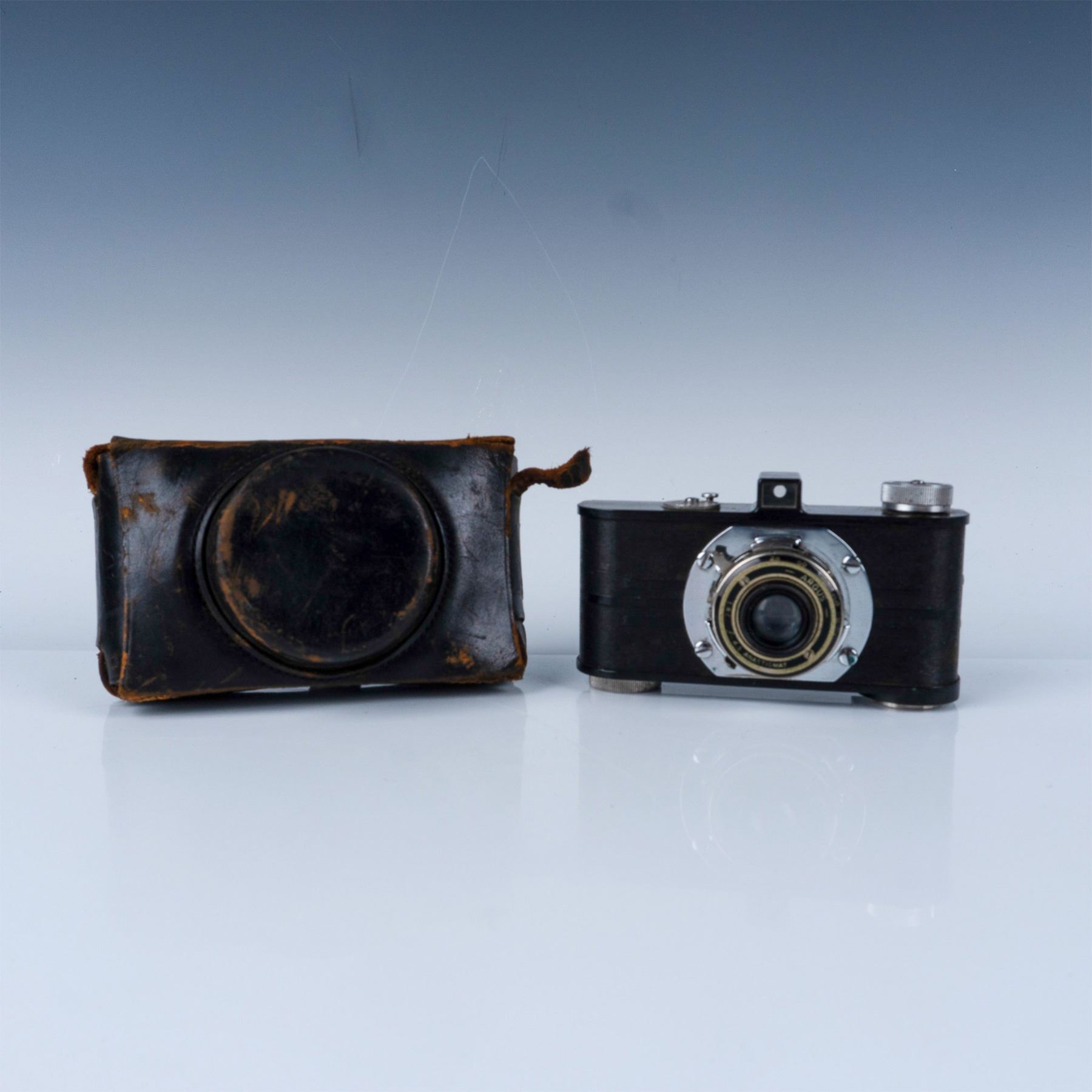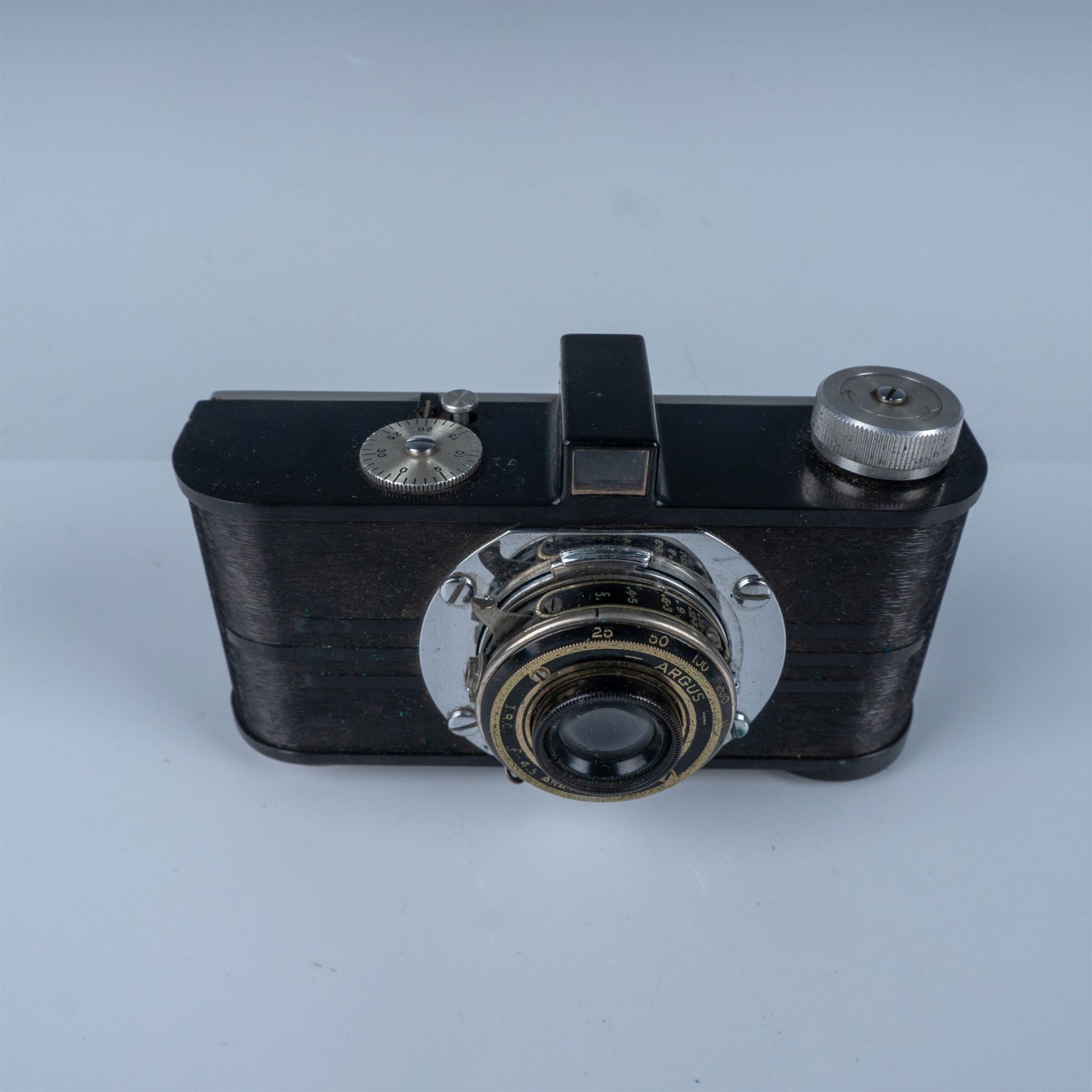 Vintage Argus I.R.C. Anastigmat 4.5 camera featuring a streamlined Art Deco design and renowned for its precision engineering. The lens is marked I.R.C. f:4.5 Anastigmat, offering a glimpse into early 20th-century photographic technology. Accompanied by its original leather carrying case, this piece reflects the timeless craftsmanship of Argus.