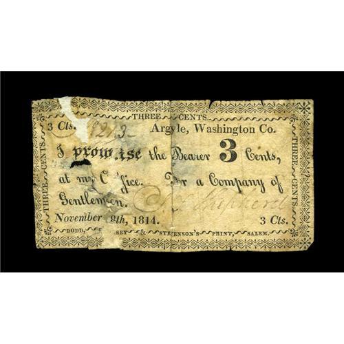 <B>Argyle, NY- C.T. Shepherd</B></I> 3¢ Nov. 8, 1814 Harris 6<BR>An excessively rare and perhaps unique piece from this early issuer, who issues "For a Company of Gentlemen." <B>Good,</B></I> with several repairs, but where can another example be obtained at any price.