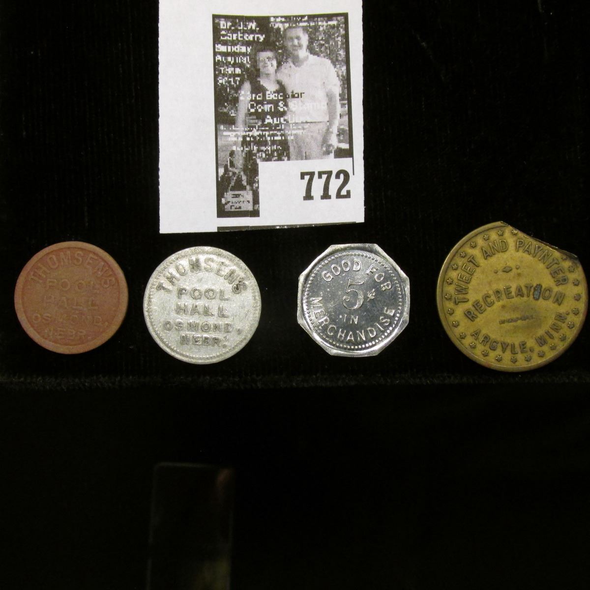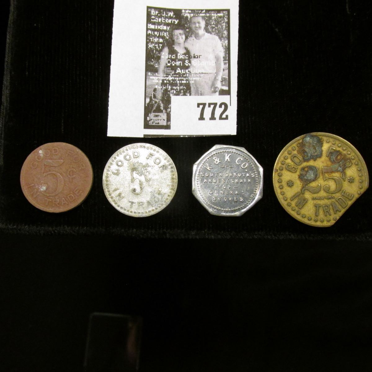 Argylle, Minn. Clipped good for 25c Trade Token; "Thomsen's/Pool/Hall/Osmond,Nebr.", pair of two different style 5c Good for Tokens; & K & K/South Dakota's/Largest Chain/of/General/Stores", Good for 5c Trade Token.