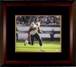 On opening day of 2010, September 12, in Houston against the Indianapolis Colts, Arian Foster replaced Steve Slaton as starting running back and broke many records, rushing 33 times for 231 yards and 3 touchdowns. Foster also posted the second-highest NFL opening day rushing total, trailing only O.J. Simpson's 250 yards in 1973. Foster finished the 2010 season by winning the Rushing Title with 1616 Rushing yards and 604 receiving yards breaking the record set by Priest Holmes for most yards from scrimmage ever by an undrafted player. He was invited to the 2011 Pro Bowl, which is his first Pro Bowl. Arian Foster has hand signed this Houston Texans 16x20 Photo. James Spence Hologram and Certificate of Authenticity. Custom Black Mat and Premium Mahogany Frame as shown.
