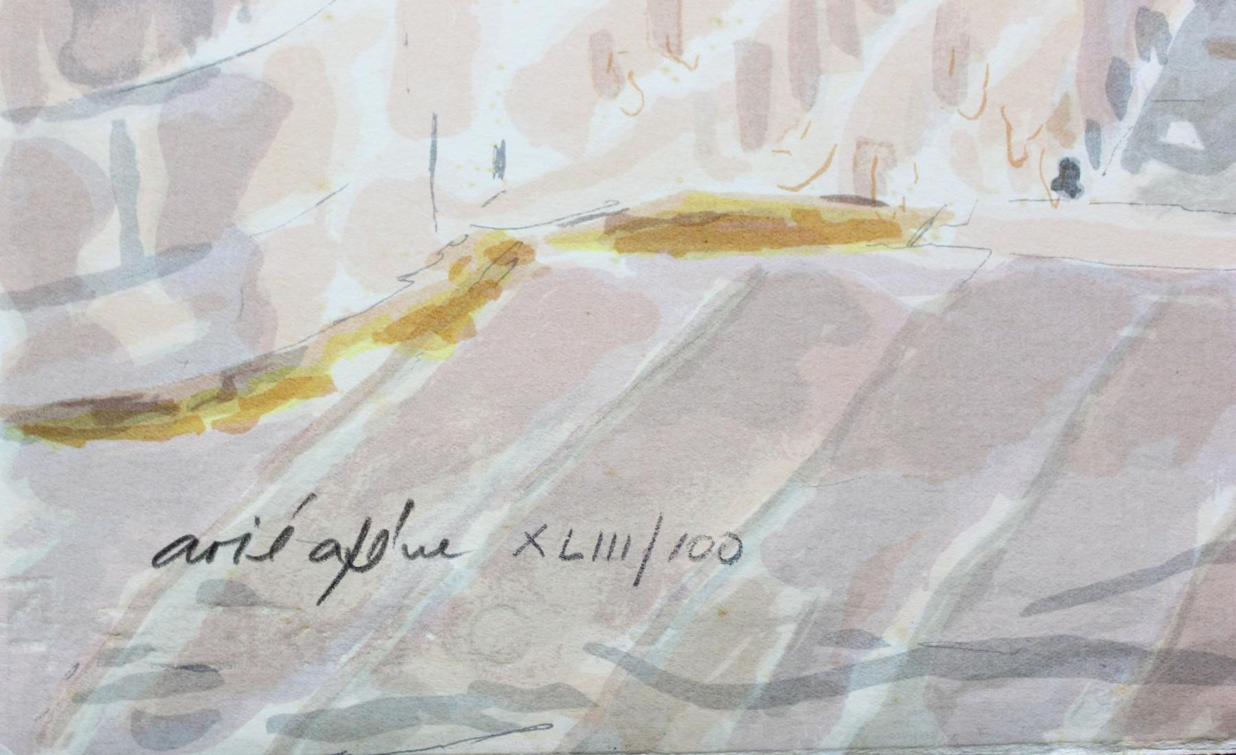 Artist: Arie Azene. Medium: Lithograph. Size (Unframed): 27.5" x 19.5". Additional: Born in 1934 in Germany, Arie Azene is an exceptional observation realist and a master of watercolor technique. He rarely limits himself to one subject of one style, constantly edging out into a variety of approaches. Subjects range from arabesque floor tiles to long views of the temple Mount, or details of shadows falling across hidden portals or wrought iron gates, in style from the Academic realism to decorative abstraction. Somehow, when thrown together on the same page, the contrasts never fight for supremacy not fall into obscurity.. Reference# 10537.