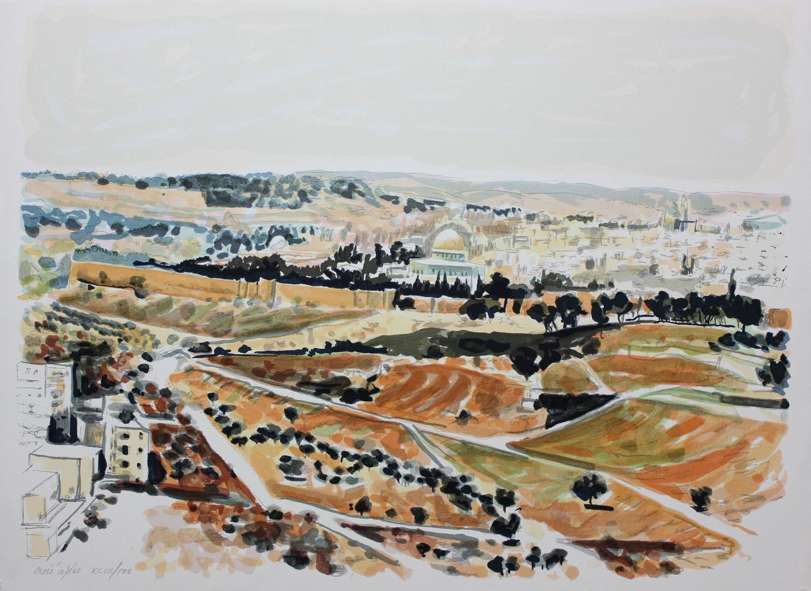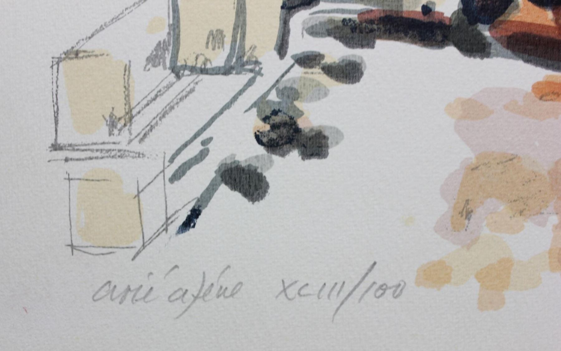 Artist: Arie Azene. Medium: Lithograph. Size (Unframed): 19.5" x 27.5". Additional: Born in 1934 in Germany, Arie Azene is an exceptional observation realist and a master of watercolor technique. He rarely limits himself to one subject of one style, constantly edging out into a variety of approaches. Subjects range from arabesque floor tiles to long views of the temple Mount, or details of shadows falling across hidden portals or wrought iron gates, in style from the Academic realism to decorative abstraction. Somehow, when thrown together on the same page, the contrasts never fight for supremacy not fall into obscurity.. Reference# 10532.