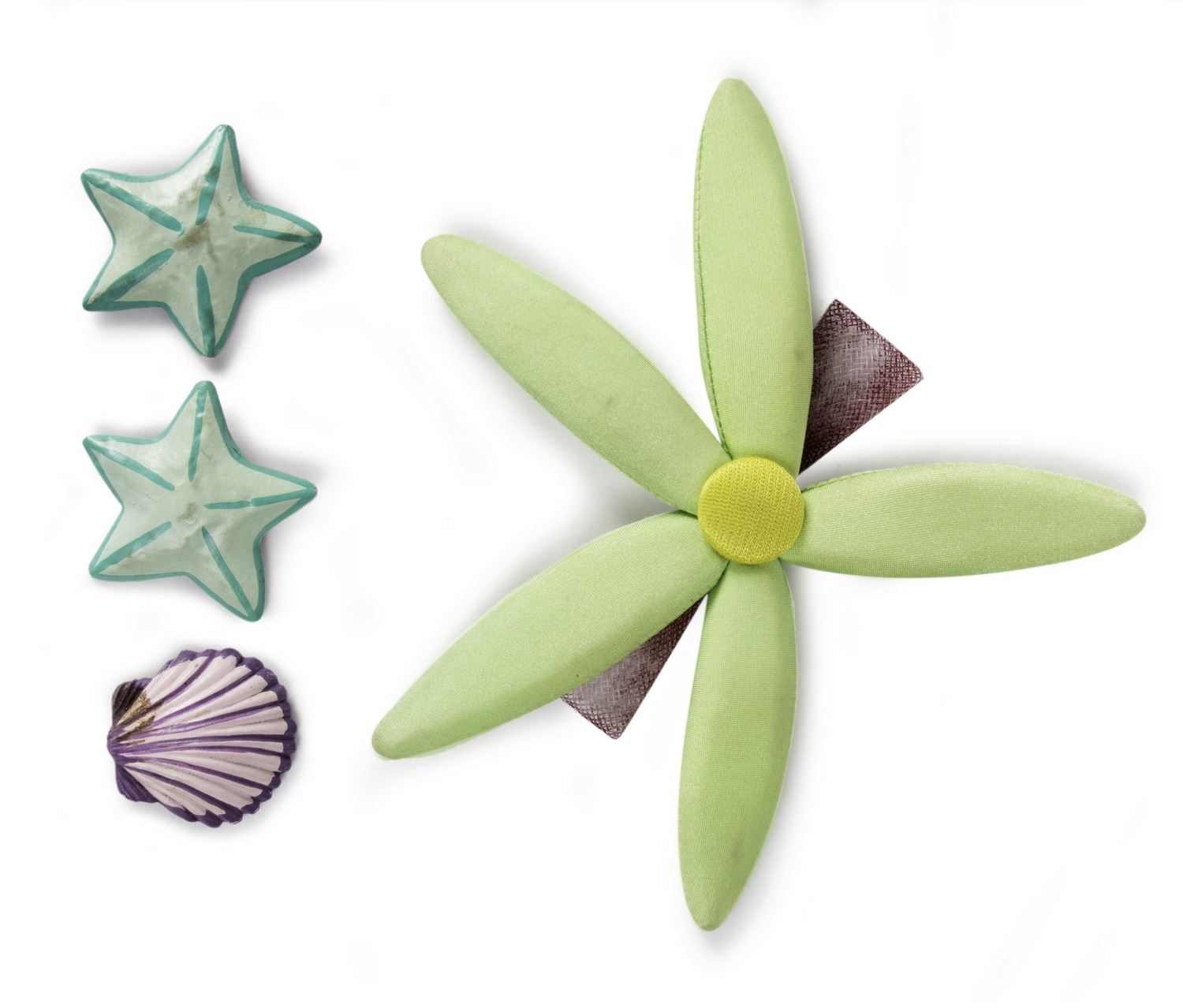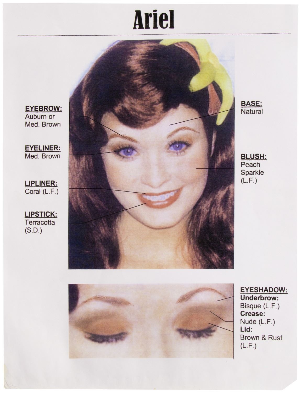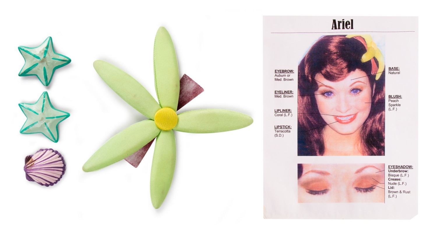 (Disneyland, c.2000) A set of props for an Ariel cast member costume at Disneyland. This set includes a starfish shaped hair accessory, as well as three small starfish and shell props. The headband includes a printed style sheet for the Ariel character which describes the types of makeup to be used and shows the headband in the photo. The smaller props are hand-painted and have velcro strips on the backs. The headband measures approximately 7" in diameter and the set is in very good condition overall with minor wear from use.