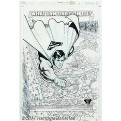 Ariel Olivetti - Original Splash Page Art for Superman #179, page 1 (DC, 2002). Ariel Olivetti captures The Man of Steel in an introspective moment. While in flight, Superman wonders, "What Can One Icon Do?", and he answers that musing with, "It's about the work you do in between." Careful attention to background details, and perspective, adds to the effect of believing a man can fly. The art measures an overall 11.25" x 17". The art is in pristine condition. Blue under-penciling shows beneath the inked art. Signed by Ariel Olivetti at the lower right. Important notice: Heritage usually auctions material at the rate of 200-250 lots per hour. On some occasions eBay Live bid software or the Internet may not be able to keep up with the pace of the auction. We recommend placing a realistic absentee bid now as insurance to avoid disappointment. Occasionally the auctioneer may eliminate or reject an eBay Live bid, and the auctioneer may also reopen a lot after the close of the eBay live bidding (usually because we missed an audience bid), and may reject your bid even if it shows you as the winning bidder. By bidding via eBay Live, you agree that Heritage may award the lot to another bidder at its sole discretion under the circumstances described above or any other reasonable circumstances. Since eBay bids are not shown to us until we open the lot on the floor, we treat those bids just like floor bids. In most cases the floor responds before the eBay bid is presented to us, due to Internet lag time, so for consistency we have made it a policy that floor bids are always considered first over tie eBay live bids. Also please note that all Heritage lots purchased through eBay Live carry a 20% Buyer's Premium. Please make sure you read the Terms and Conditions before you bid.