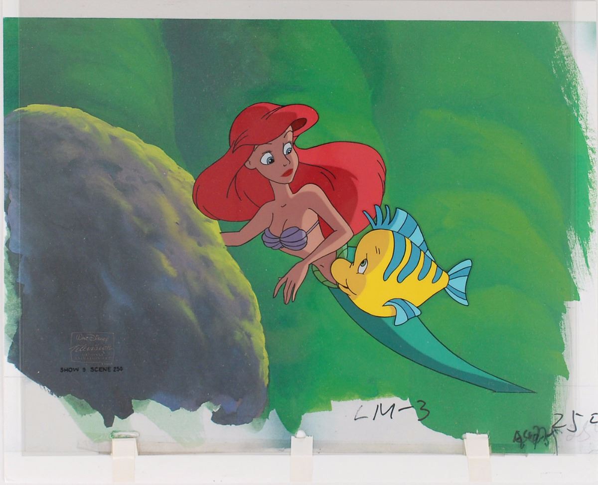 (Walt Disney Studios, 1992) Original production cels featuring Ariel and Flounder from the Little Mermaid TV Show, showing the pair swimming together in scene 250 of episode three, entitled ‘Urchin.’ The cels are placed on a Disney color copy background and slightly trimmed to 12.5 x 10.5. The images measure 3.25 x 2.75 and 8 x 6.75, with overall dimensions of 13.5 x 11.25. The piece has the silver Walt Disney Company seal to upper right, with the Walt Disney Studios Certificate of Authenticity included. In fine condition.