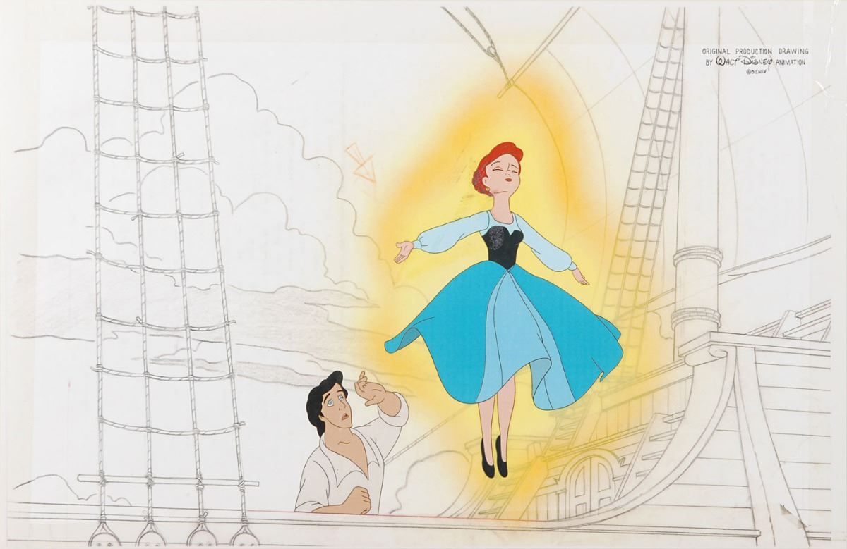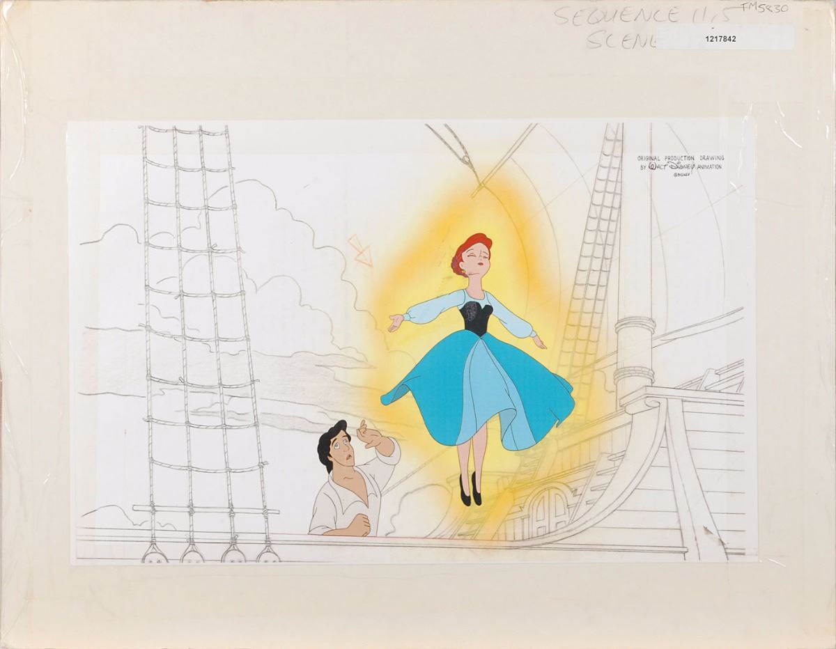 (Walt Disney Studios, 2000) Original production cel and drawing featuring Ariel and Prince Eric from The Little Mermaid II: Return to the Sea, showing them aboard the ship. The cel is placed on the original matching production background layout drawing. Image measures 6.5 x 7.5, with overall dimensions of 17 x 13.5. In fine condition. Accompanied by a Disney Enterprises certificate of authenticity.