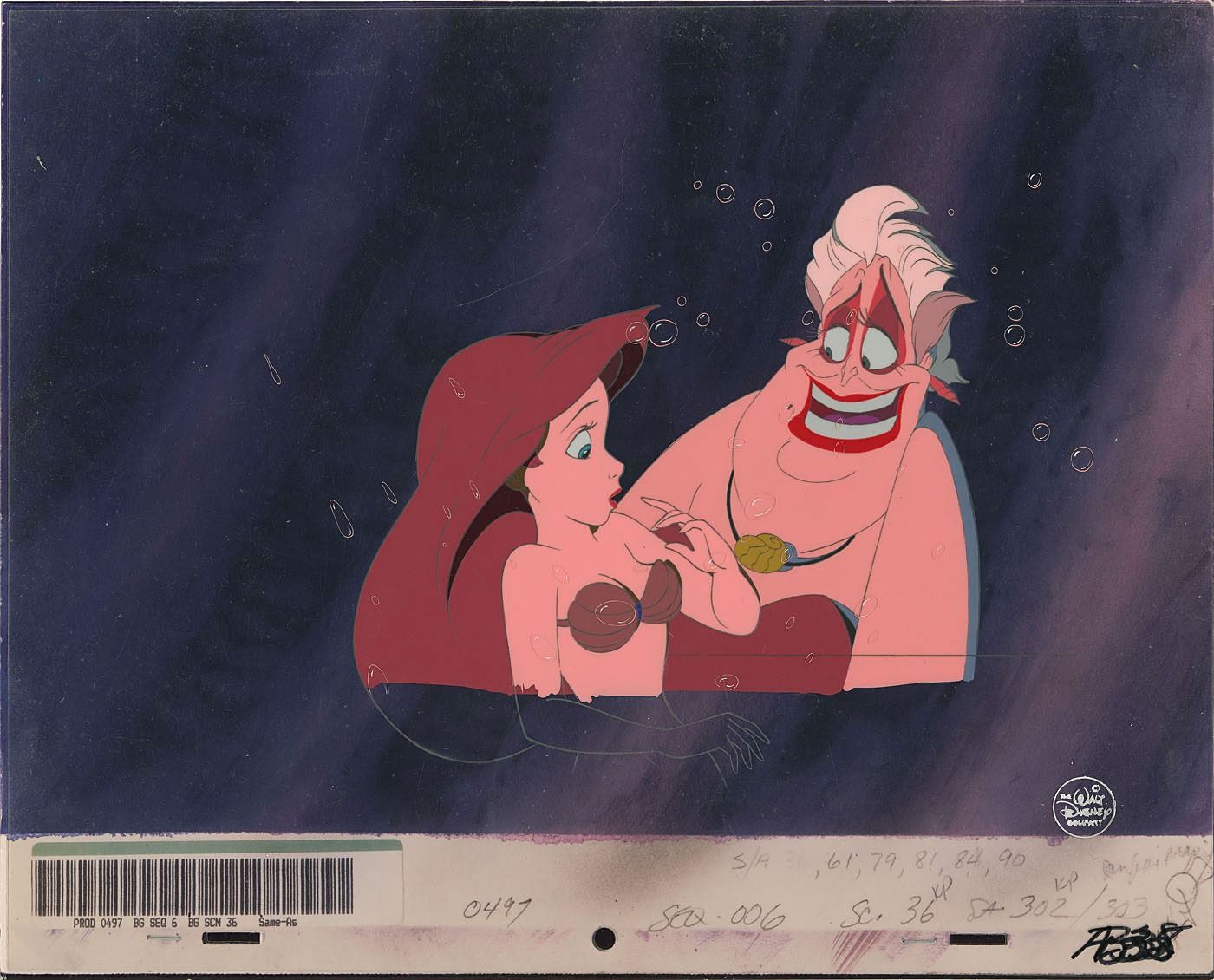(Walt Disney Studios, 1989) Original production cels featuring Ariel and Ursula from The Little Mermaid, showing the mermaid princess and villainous sea witch side-by-side, with an additional bubble effect overlay. The cels are placed on a photographic color copy background. Image measures 6.75 x 5.5, with overall dimensions of 13 x 10.5. The piece has the silver Walt Disney Company seal to lower right. In fine condition.
