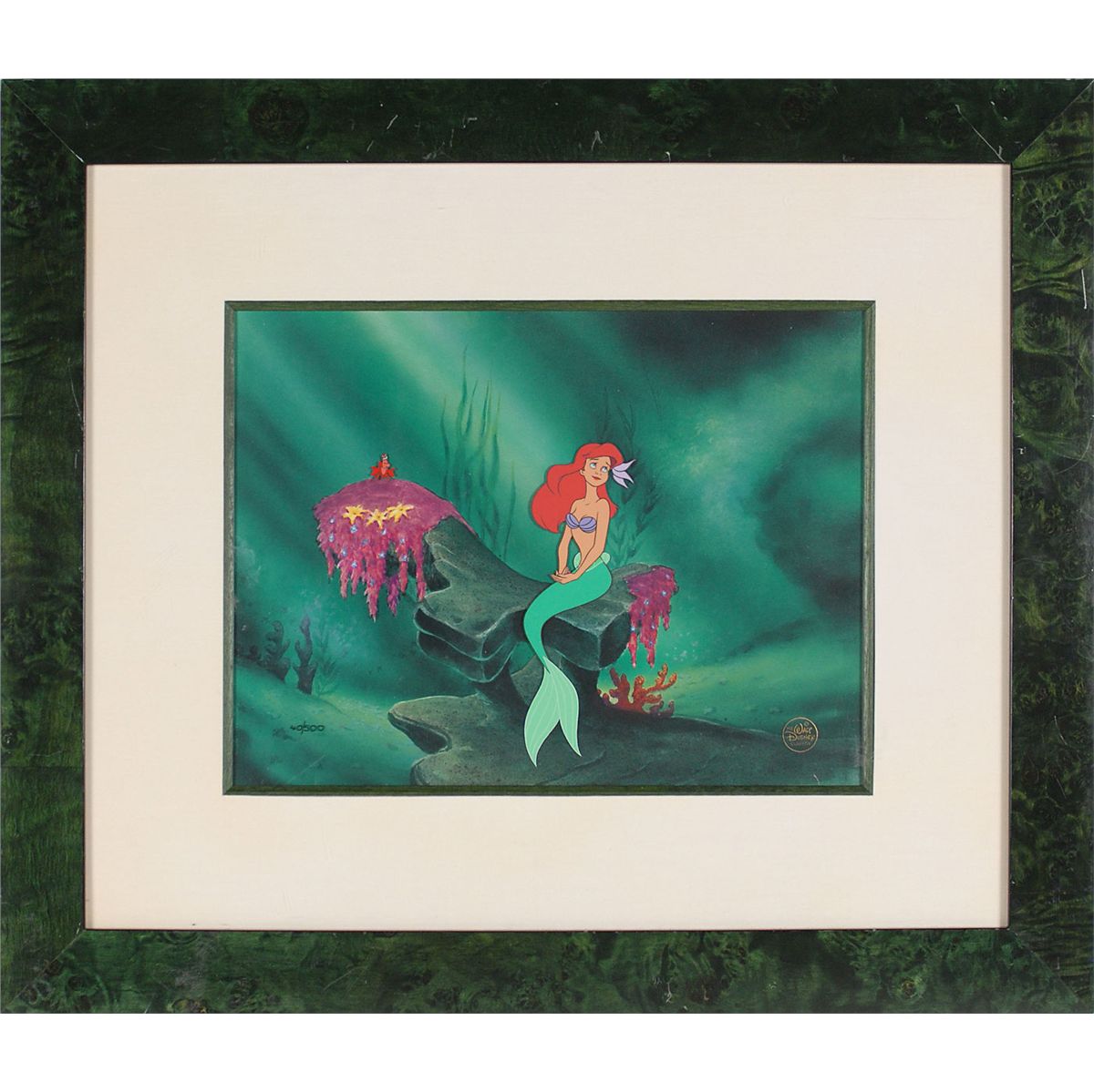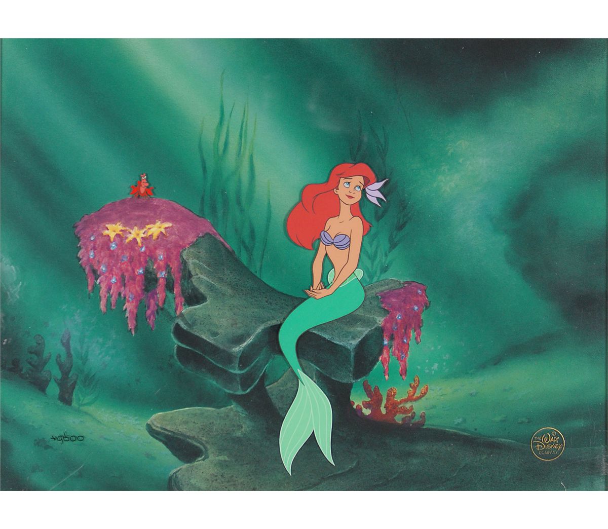 (Walt Disney Studios, 1993) Limited edition hand-painted cel featuring Ariel from The Little Mermaid, numbered 40/500, showing Ariel sitting on a rock with Sebastian the crab. The cel is placed on a color copy background. Image measures 2 x 6, with a mat opening of 12 x 9. This piece is also framed to an overall size of 21 x 18. The piece has the Walt Disney Company seal on lower right and is accompanied by its certificate of authenticity. In fine condition.