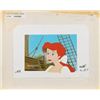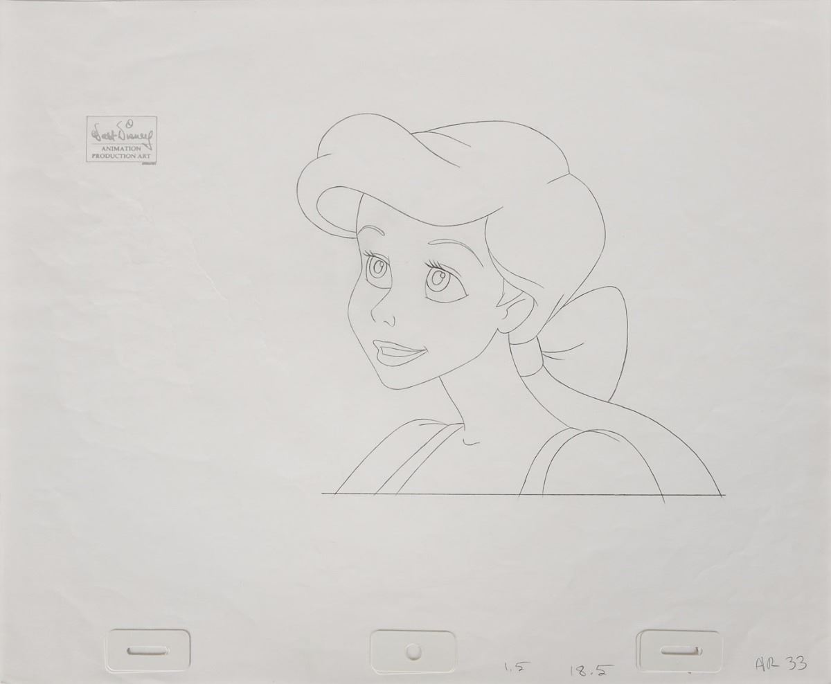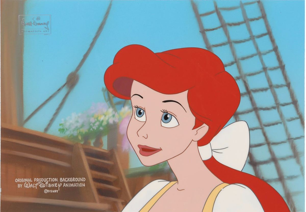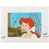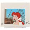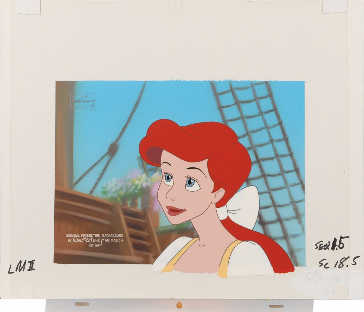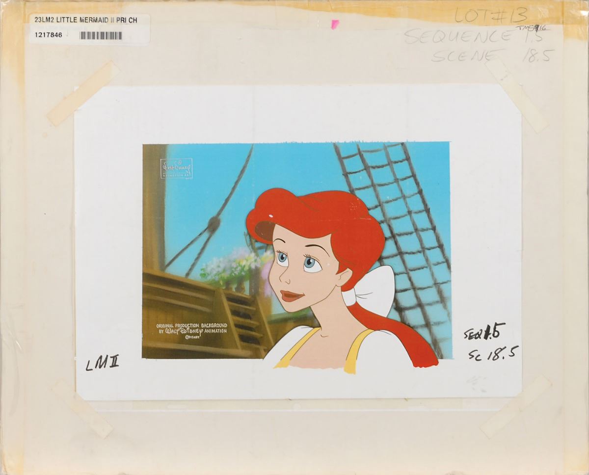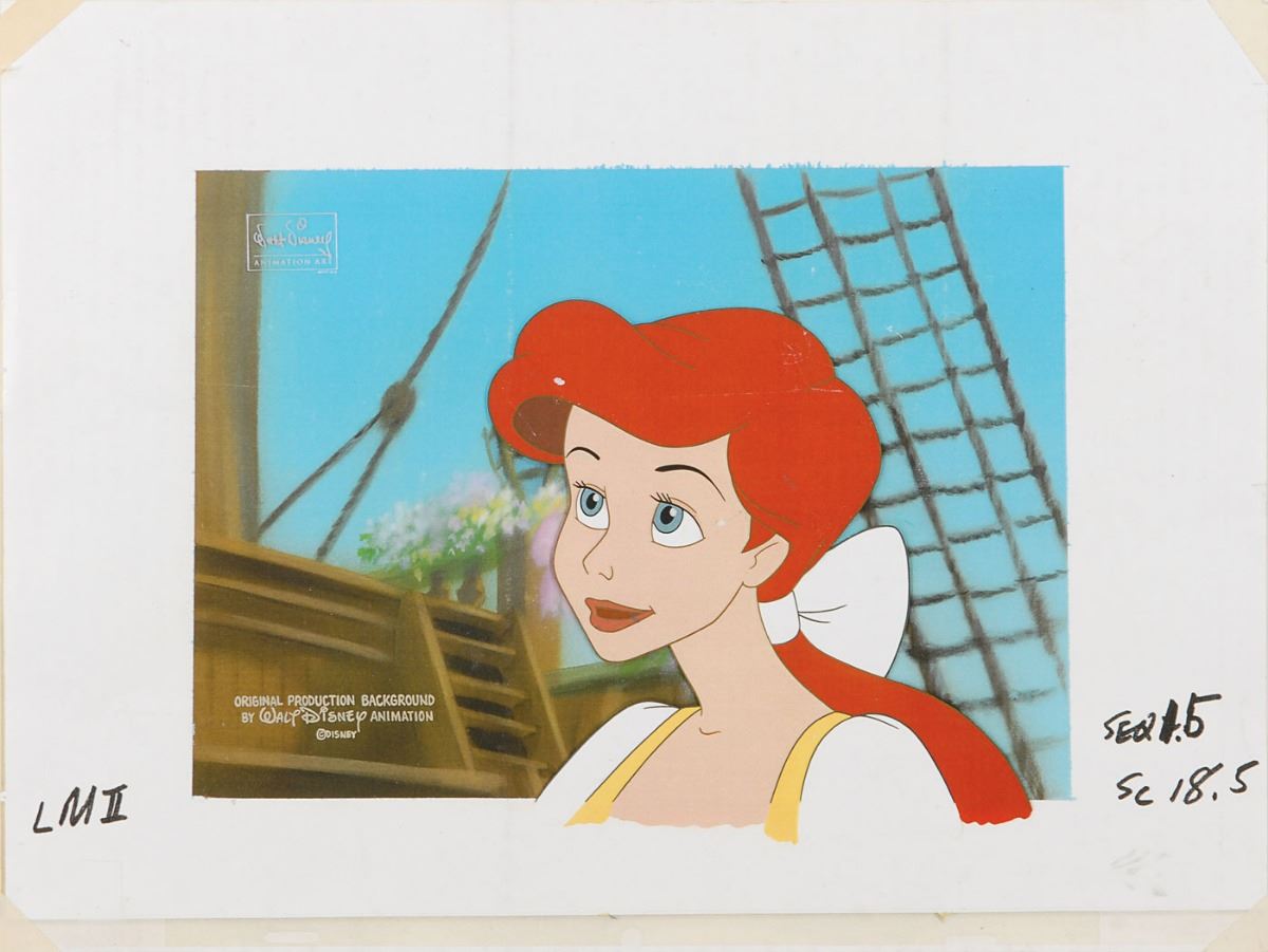 (Walt Disney Studios, 2000) Original keymaster background set-up featuring a close-up of Ariel from The Little Mermaid II: Return to the Sea, showing her aboard the ship at sea. The cel is placed on a hand-painted keymaster production background. Image measures 6.5 x 6, with overall dimensions of 15 x 11.75. Includes the original matching production drawing. In fine condition. Accompanied by a Disney Enterprises certificate of authenticity.