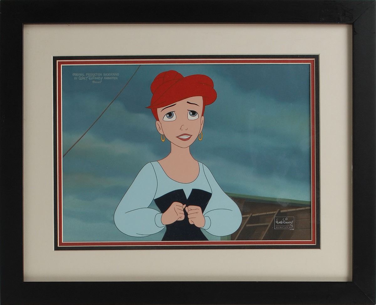 (Walt Disney Studios, 2000) Original production cel and production background from The Little Mermaid II, showing a lovely half-length pose of Ariel in human form. The cel is placed on a key master background set-up. Image measures 6.75 x 9, with a mat opening of 13.25 x 9.5. This piece is also framed to an overall size of 20 x 16.25. The piece has the silver Walt Disney Company seal to lower right, and is hand-painted in the upper left corner, “Original production background by Walt Disney Animation.” Walt Disney Studios Certificate of Authenticity included. In fine condition.