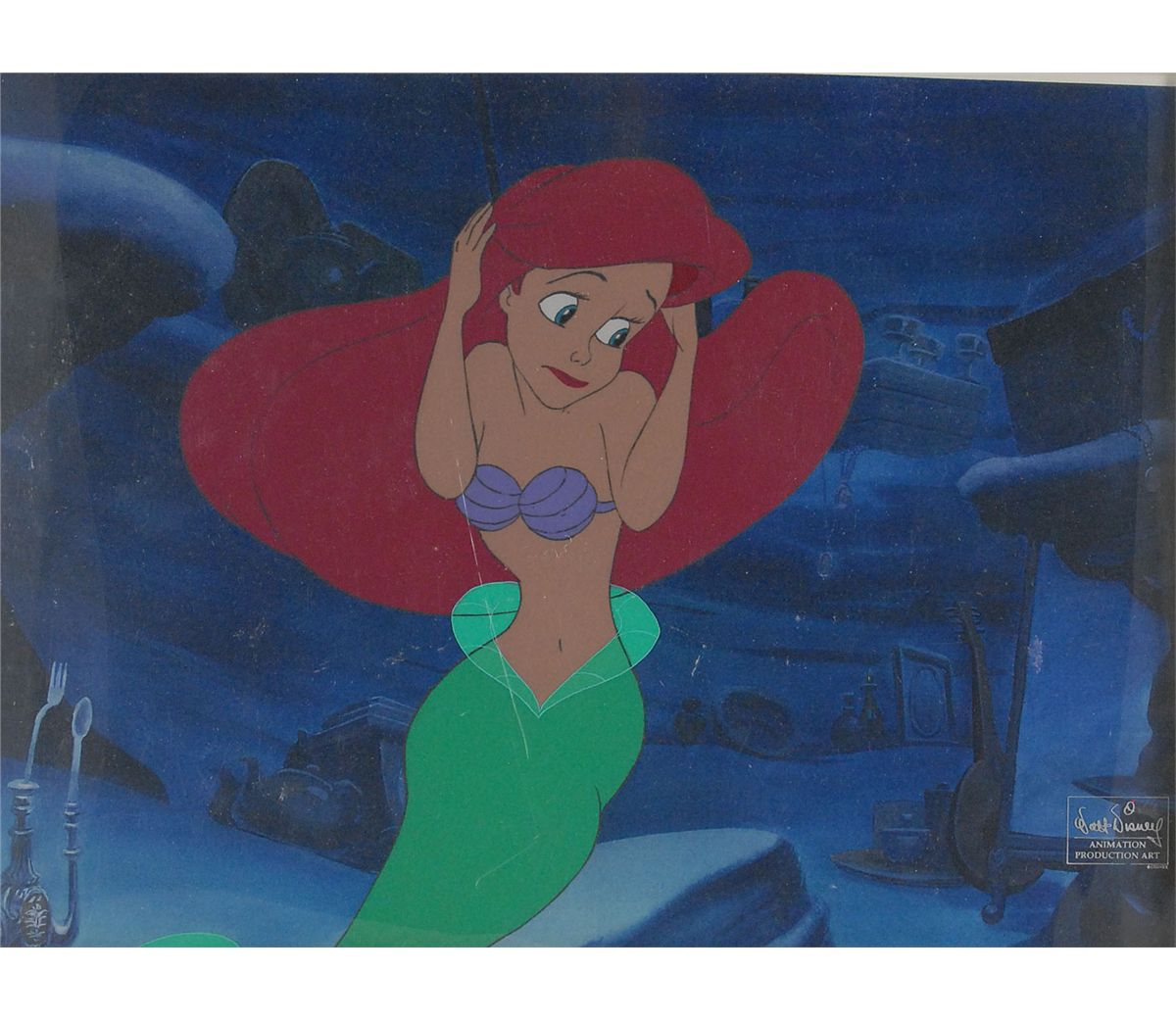 (Walt Disney Studios, 1989) Original production cel featuring Ariel and Flounder from The Little Mermaid, with the concerned-looking Ariel prominently in the center and Flounder swimming on the far left. The cel is placed on a matching studio copy background. Character images measure 8 x 8.75 and 1.75 x 3.5, with overall dimensions of 17 x 12.25. Disney seal to lower right. In fine condition.