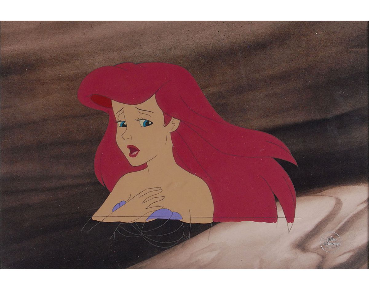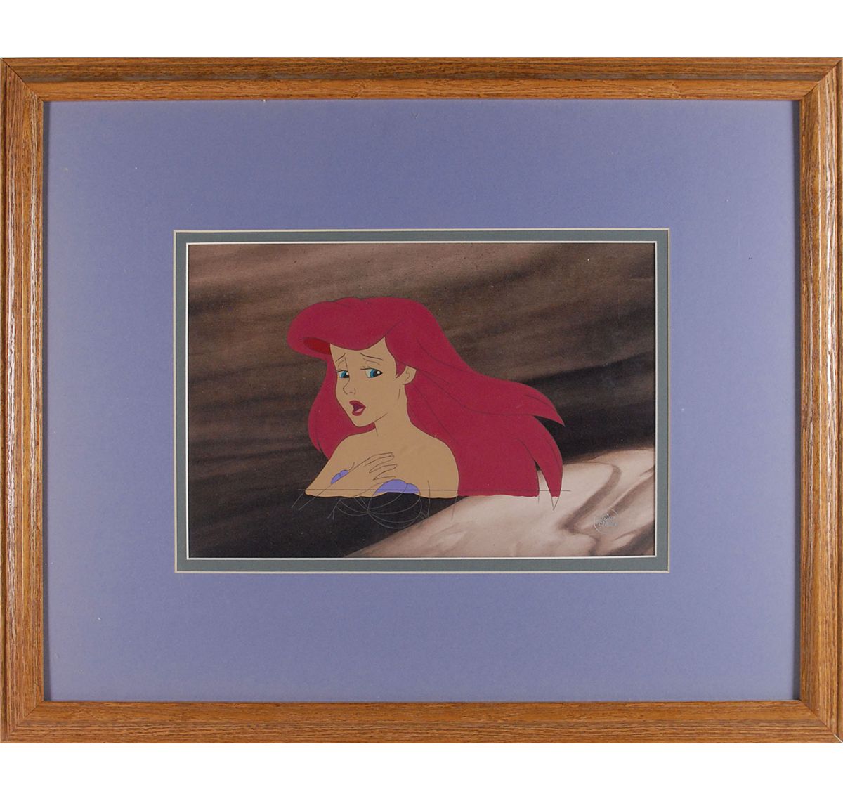 (Walt Disney Studios, 1989) Original production cel featuring Ariel from The Little Mermaid, showing her in a portrait pose with a concerned look on her face. The cel is placed on a matching studio copy background. Image measures 7 x 5, with a mat opening of 12 x 8. This piece is also framed to an overall size of 22 x 18. Disney seal to lower right. In fine condition.
