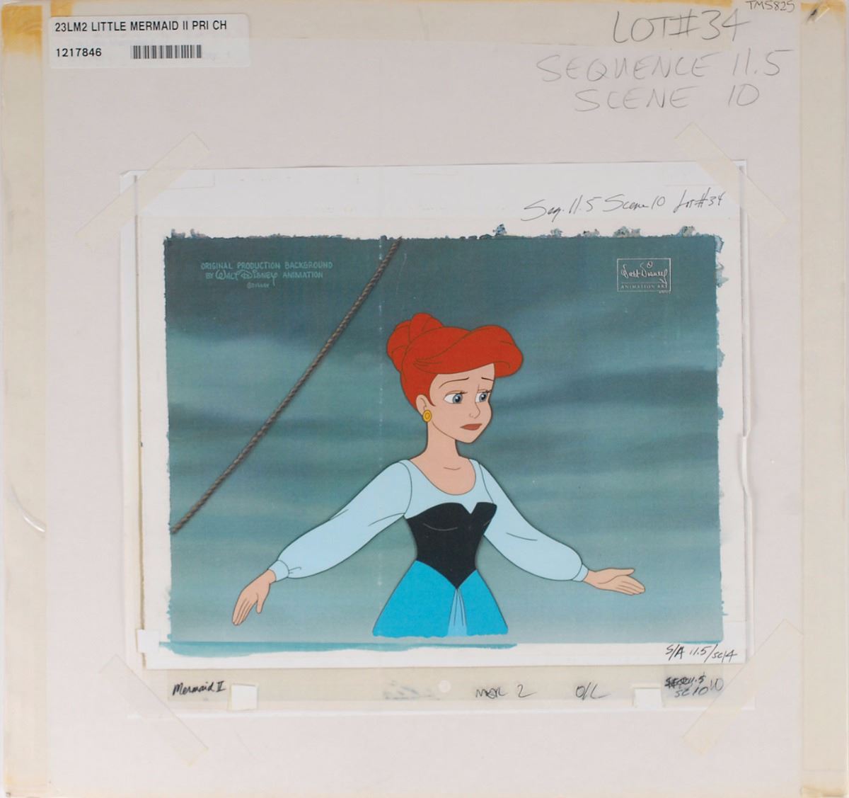 (Walt Disney Studios, 2000) Original production key master background set-up and production drawing featuring Ariel from Little Mermaid II, showing her standing with her arms slightly raised. The cels are slightly trimmed to 12 x 10 and placed on a hand-painted original production background. Image measures 8.25 x 6.5, with overall dimensions of 12 x 11. The piece has the silver Walt Disney Company seal to upper right, with the Walt Disney Studios Certificate of Authenticity included. In fine condition.