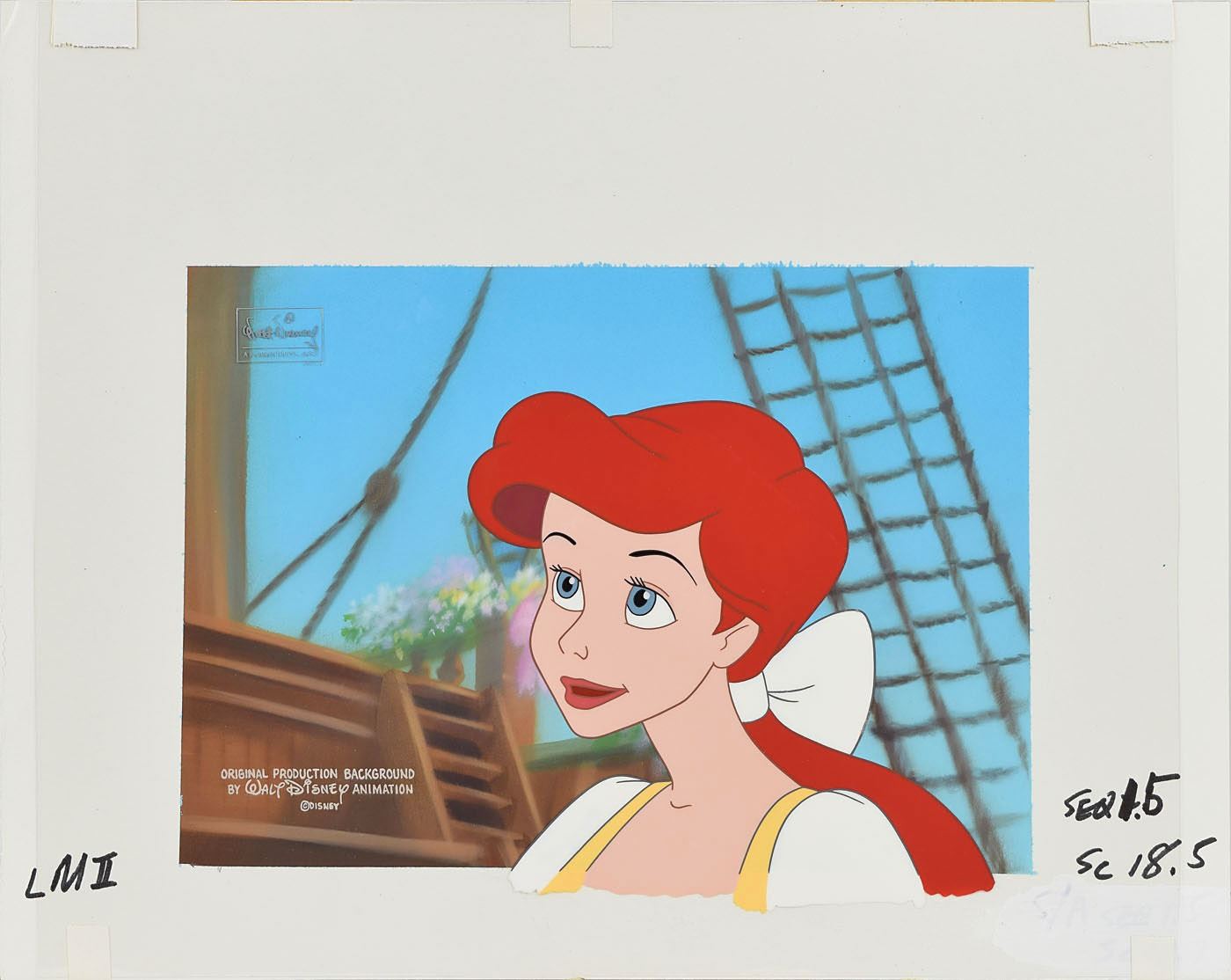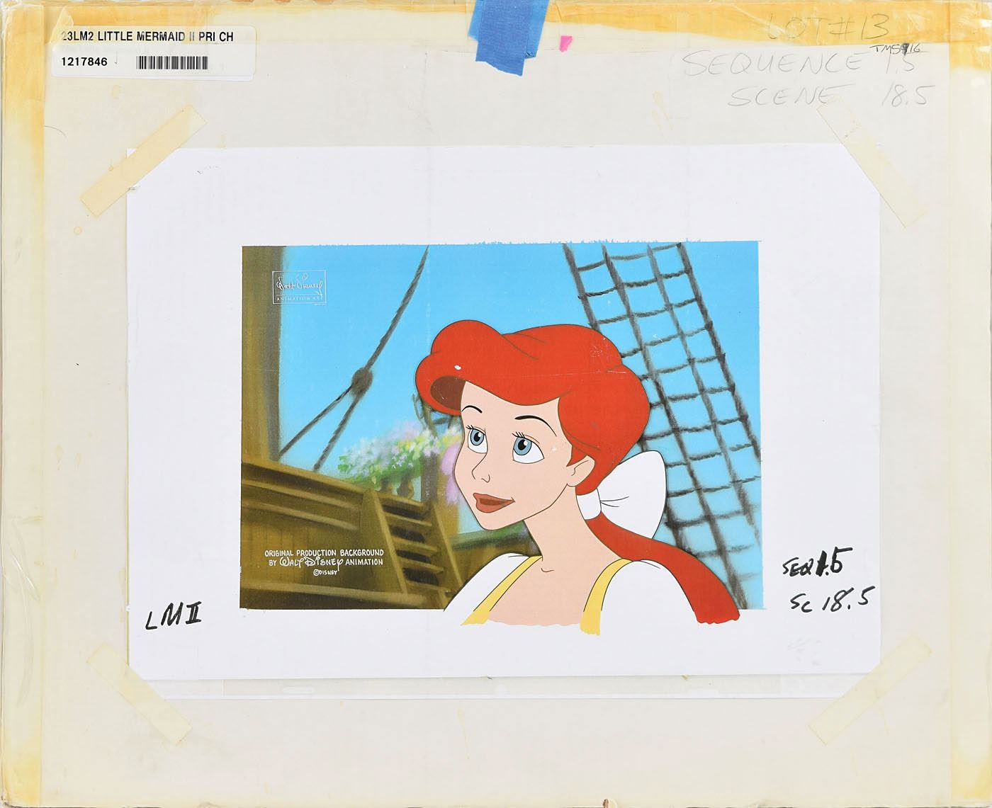 (Walt Disney Studios, 2000) Original production key master background set-up and matching production drawing featuring Ariel from The Little Mermaid II: Return to the Sea, showing the princess in an attractive close-up pose aboard a ship. The cel is placed on a hand-painted production background from the same film, marked in the lower border, "LM II, Seq. 1.5, SC 18.5." Image measures 6.5 x 6.25, with overall dimensions of 15 x 11.75. The matching production drawing is accomplished in graphite on an untrimmed 12.5 x 10.5 sheet of animation paper, marked below, "1.5, 18.5, AR 33." Also includes an 11 x 17 camera exposure sheet from Walt Disney Animation Canada, annotated in graphite and color pencil, with upper border designated as "Seq. 1.5," "Scene 18.5," "Footage 2 +10," "Animator Marc," and "Prod. #4354–700." Both the cel and drawing bear silver Walt Disney stamps. In overall fine condition. Accompanied by a certificate of authenticity from Disney Enterprises, Inc.