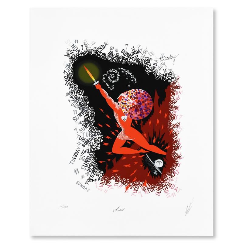 "Aries" is a limited edition serigraph on paper, numbered 28/350 and hand signed by Erte (1892-1990). Includes Letter of Authenticity. Measures approx. 21" x 25" (border), 13.5" x 19" (image). Due to the age of this piece there is slight discoloration on the edge of the borders that may be concealed when framed.