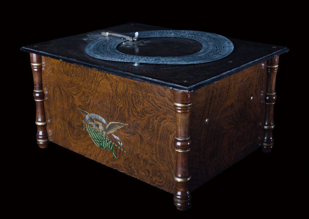 Ariosa. Table organ with reeds and interchangeable zinc rings. With 10 rings. Museum's quality. 44,5 x 33,3 x 23cm. Schmidt & Co. Phoenix Musikwerke, Leipzig, Germany, circa 1904.
