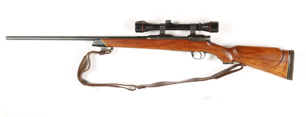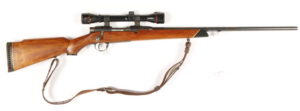 Sporterized Japanese military rifle with 24" barrel. Blued finish, sporterized pistol grip wood stock with cheek piece and rosewood forend cap, added recoil; pad leather sling and fitted with Aloma 4X32 scope. Bolt has been reworked and handle has been turned down. Good action and dark bore. Condition: Good overall as sporterized. *Curio & Relic Firearm*