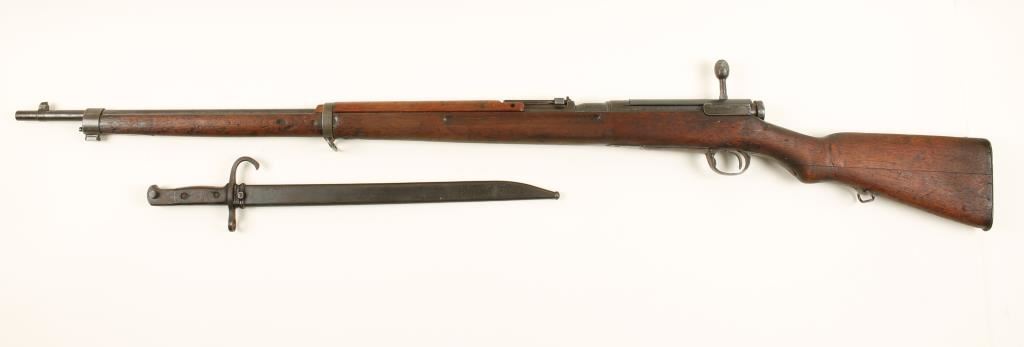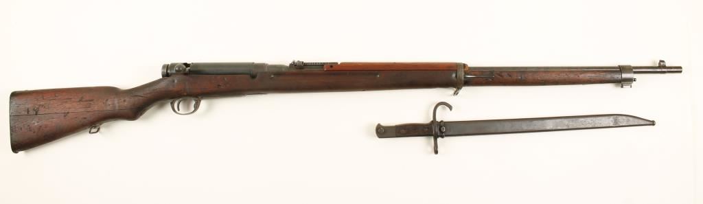 Japanese military bolt-action rifle with a 31.3" barrel, a bayonet and a scabbard. "Mum" has been defaced. Bluing is worn/faded with freckles of surface rust. Trigger guard and floor plate are a mottled brown patina. Bolt handle has deep pitting. Wood is dark and the joint in the butt is parting. There is a big crack by the bolt stop. Many scratches, dings, dents and gouges. Bore is dark with rifling. Action might fire but safety won't engage. Bayonet blade is 15-11/16" long. Condition is fair. *Modern Firearm*