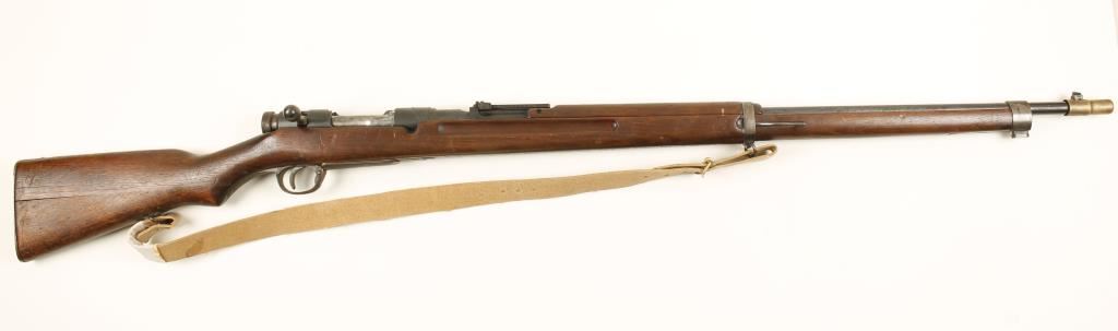 Japanese military blued bolt-action rifle with a 31.1" barrel, a 2-piece brass muzzle cover and a cloth sling. The "Mum" is intact. Bluing has some surface rust and light pitting. Bottom metal and floor plate have lots of surface rust. Wood is split along the joint in the butt and there are many small scratches and dents. Bore is dark with strong rifling. Action is good. Condition is good