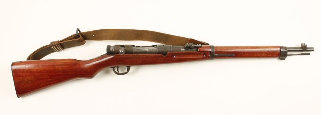 Blued Japanese military bolt-action carbine with a 19" barrel. Bluing is dull with wear and fading. "Mum" is intact. Butt[plate is worn dark with pitting. Bottom metal has patina and scratches. Floor plate is worn to bare metal at front and polished blued at rear. Two piece buttstock with hand guard is in good, probably refinished, condition with some dings, scratches and rubs. Bore is dark with strong rifling. Action is working well. Condition is good. *Modern Firearm*