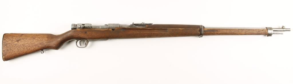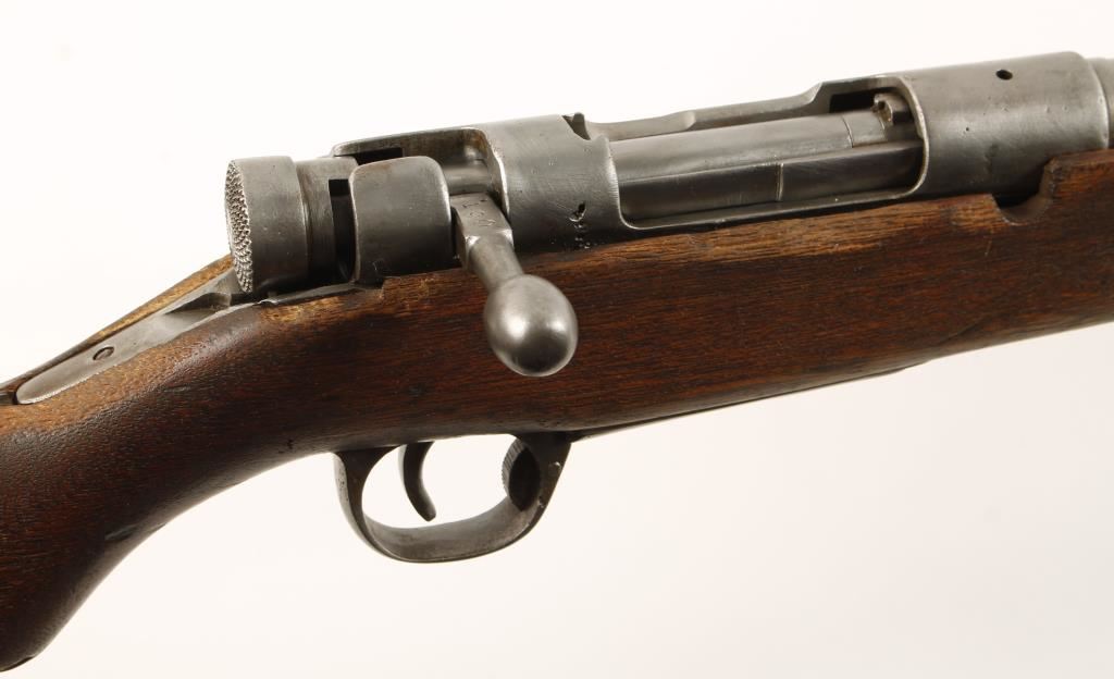 Japanese made blued bolt action rifle with a 31" barrel. Hinged floorplate on non-detachable box magazine. Almost all metal surfaces have been worn/stripped back to being in-the-white. The bore is dark with rifling. Receiver was scrubbed not only of the Mum but also the manufacturer, type and serial number. The wood stock has also lost most of its finish. Steel has extensive pin-prick pitting. the action does not work. Bring back from Korea. Condition is poor. *Modern Firearm*