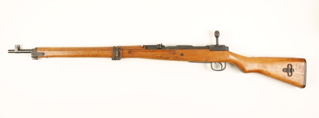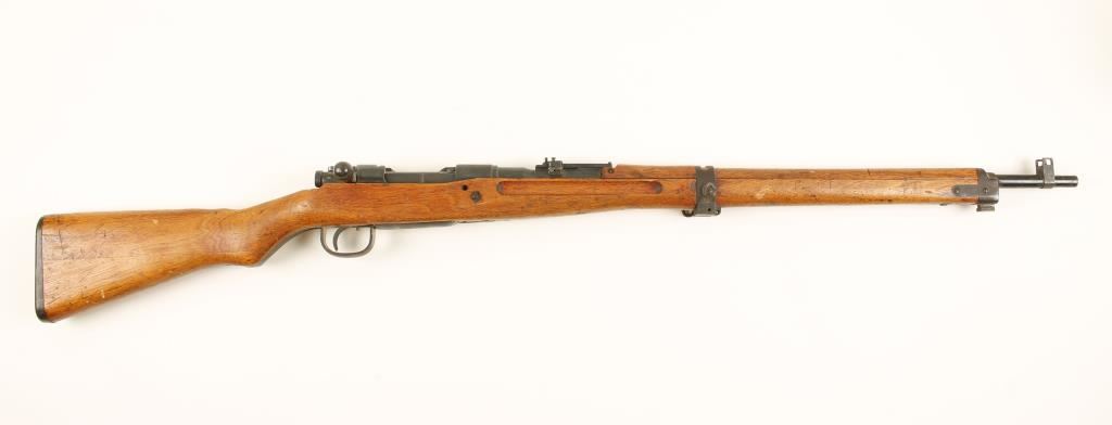 Japanese military blued bolt-action parts rifle with a 26" barrel. "Mum" has been ground off. Bluing is good with some dullness and freckling from surface rust. Has the monopod barrel band without the foot. Aircraft sight arms are missing from the rear sight. Stock has dings, rubs and dents. Bolt is the body only. Bore is frosty with good rifling. Action doesn't work. Condition is fair to good. *Modern Firearm*