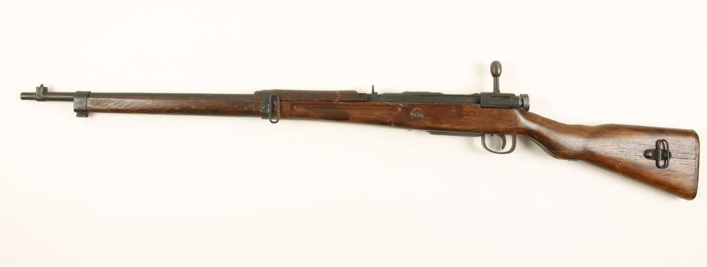Japanese military blued bolt-action rifle with a 26" barrel and a reproduction bayonet (with a 15-1/2" blade) and scabbard. "Mum" is ground off and there is no Type marking. Fixed rear sight. Metal is all flat black with rough surface. Butt plate is wood. This is a late war product. The stock has a long crack running through the cross bolt back almost to the upper tang and forward to below the upper handguard. Bore is dark with rifling. Action is working. Condition is poor. *Modern Firearm*