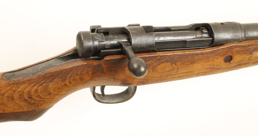 Japanese military blued bolt-action rifle with a 26" barrel. "Mum" is intact. Bluing is mottled with surface rust and rust stains. There is pitting on the trigger guard and floorplate. Wood joint in the buttstock is splitting and there are many dings and rubs. Rear sight has lost its aircraft sight arms. There is no cleaning rod and 2 screws in the bayonet lug nose cap are missing.. Bore is shiny with good rifling. Action works well. Condition is fair. *Modern Firearm*