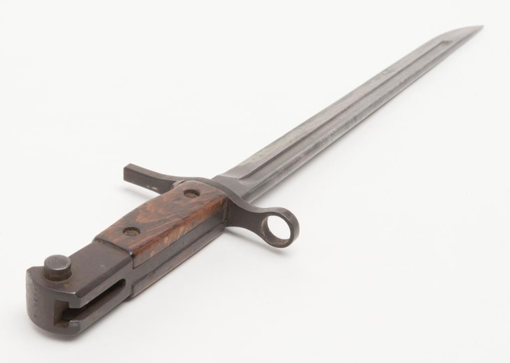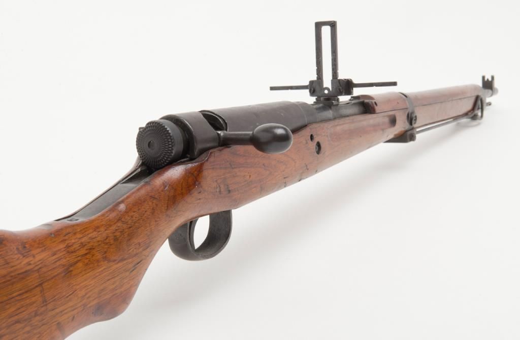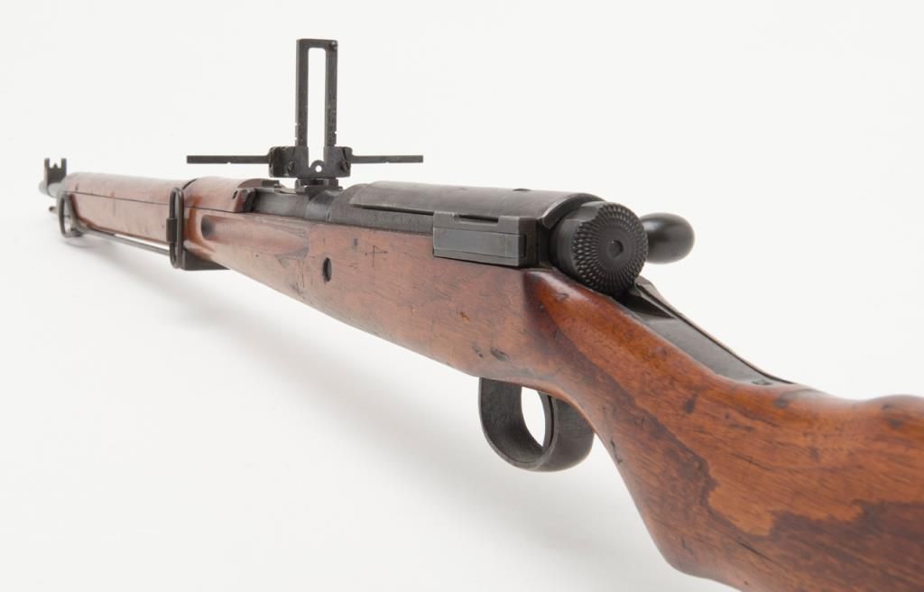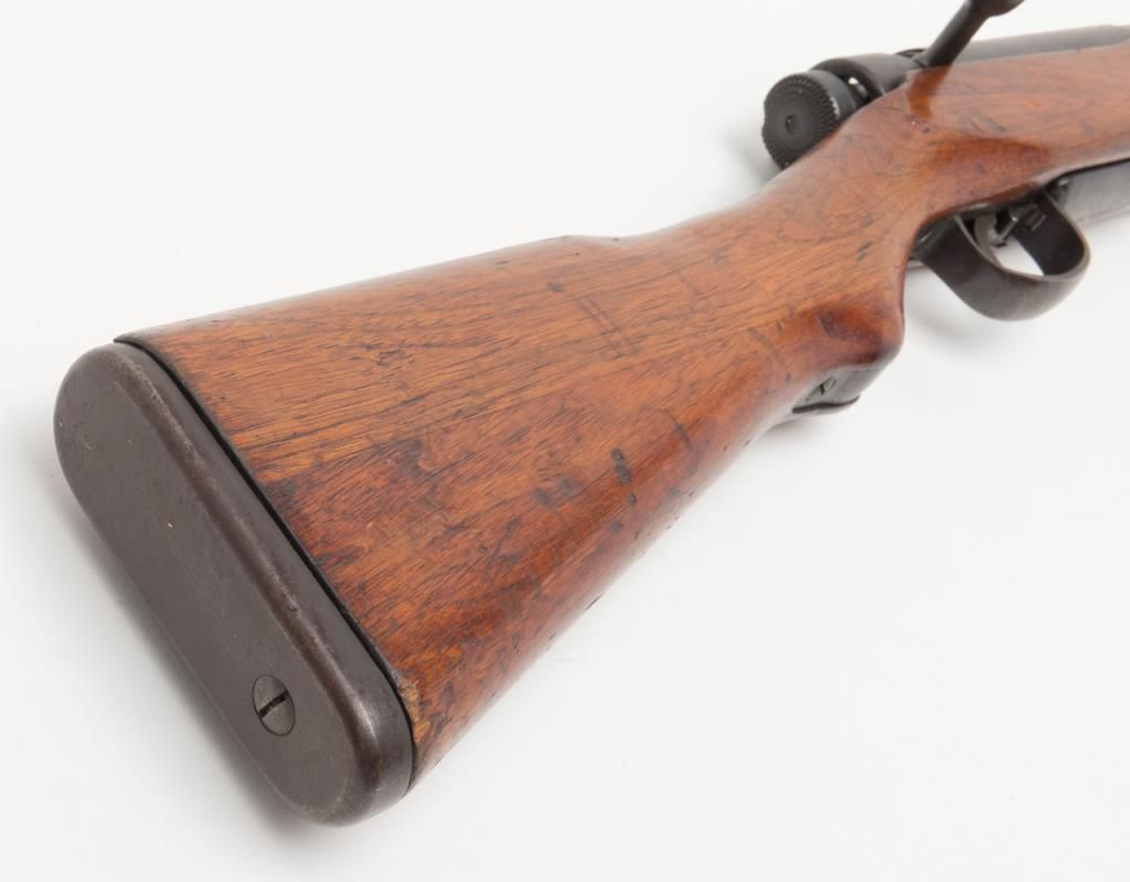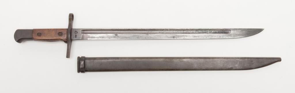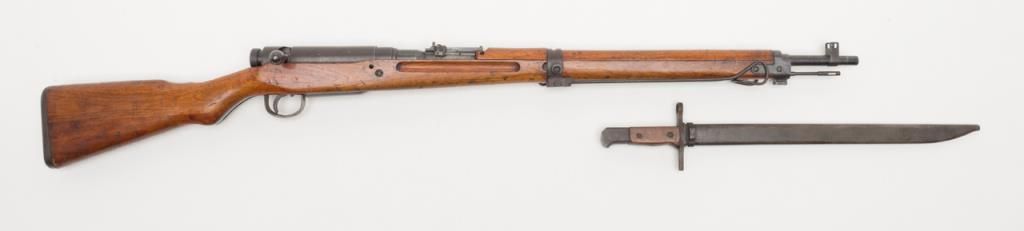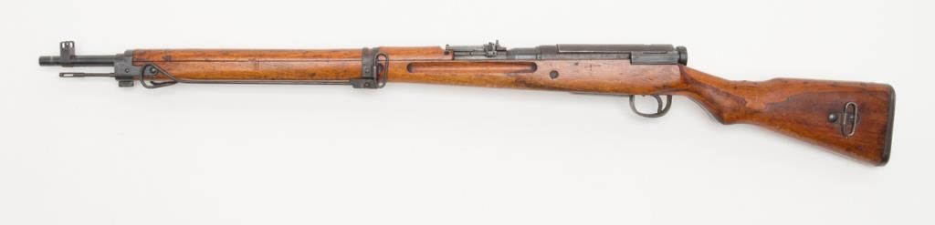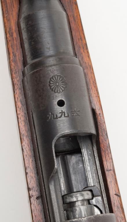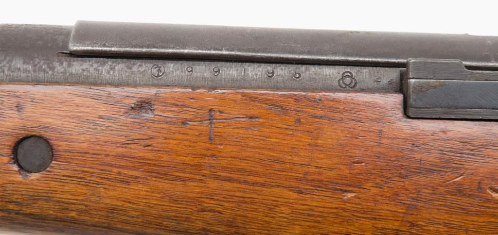Arisaka Type 99 bolt action rifle, 7.7 mm caliber, Serial #99195. The rifle is in overall good to very good condition. The rifle retains the majority of its military finish with 21” sword bayonet and scabbard. The rifle includes theintegral bipod, tangent sight with aircraft wings, cleaning rod and Chrysanthemum marked action with dust cover. The smooth wood stocks are in overall good condition with mars and dents consistent with use. The bore is very good, the action crisp and markings sharp on this outstanding Arisaka. (C+R/PPT). Est. $350-$700.