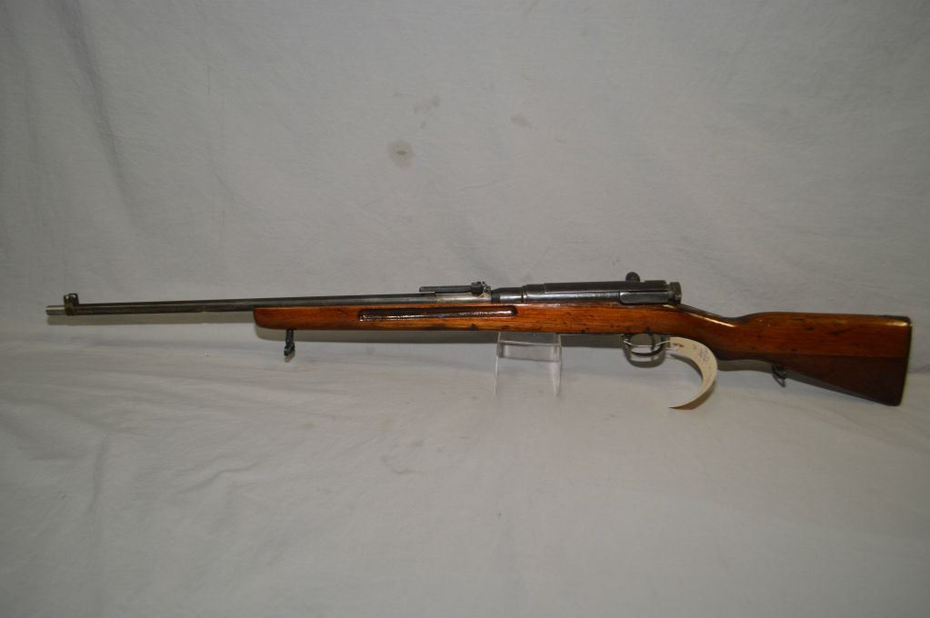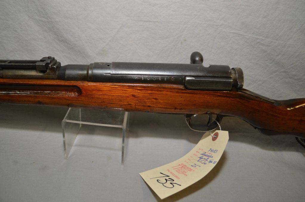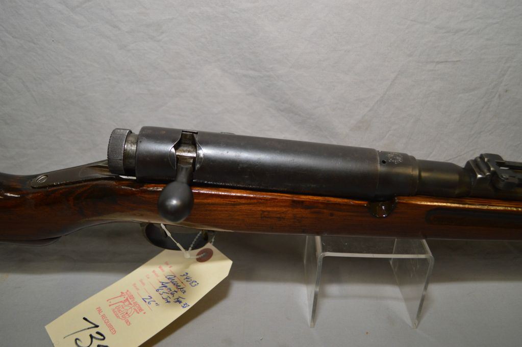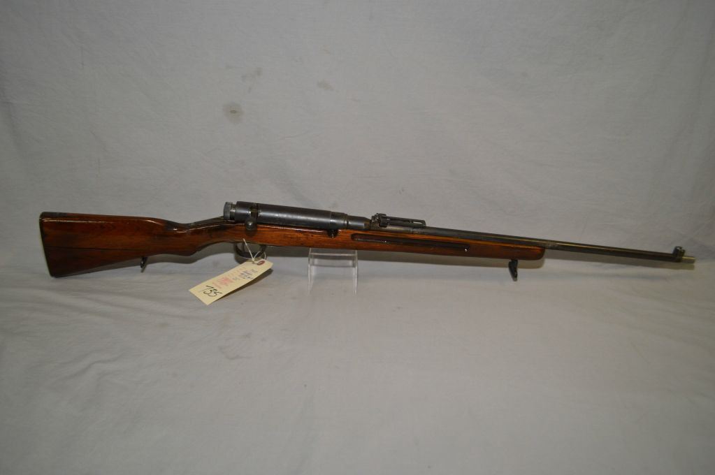 Arisaka model Sporter, type 38, 6.5 Jap cal. sporterized rifle with 26" barrel [ Fading blue finish with some heavy pitting on barrel, chrysanthemum stamped over with circles, has dust cover, re-varnished two piece stock with sling swivels] Serial: 34083