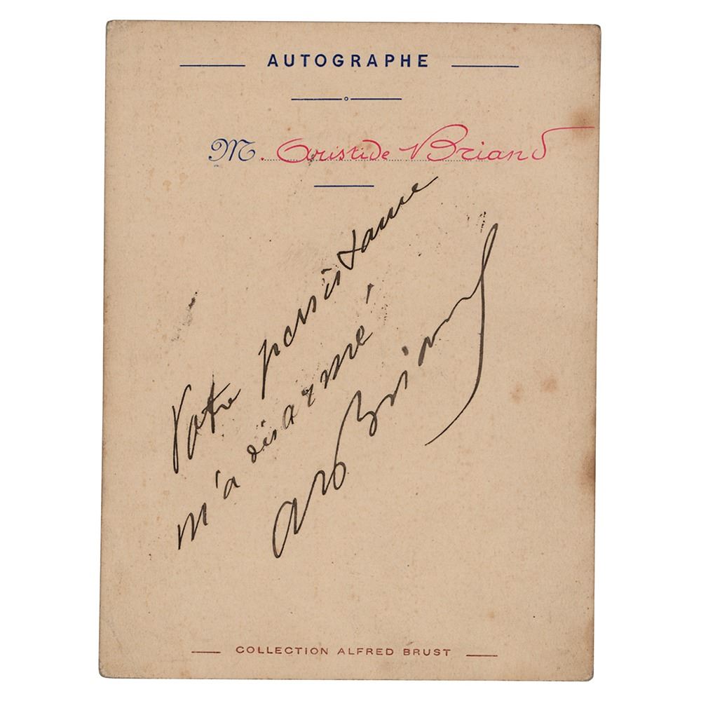 French statesman (1862–1932) who shared the 1926 Nobel Peace Prize with German Foreign Minister Gustav Stresemann for the realization of the Locarno Treaties, which aimed at reconciliation between France and Germany after World War I. Ink signature in French (translated), "Your persistence has disarmed me, A. Briand," on an off-white 4 x 5.5 stationery sheet imprinted with "Autographe, Collection Alfred Brust." In fine condition, with a few spots of foxing.