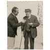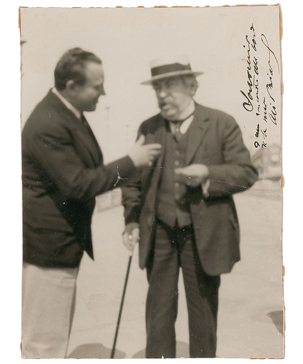 French statesman (1862–1932) and co-laureate of the Nobel Peace Prize in 1926. Vintage pearl-finish 6.5 x 9 photo of Briand with great Austrian tenor Richard Tauber, vertically signed in black ink, “Souvenir d’une rencontre au bord de le mer, Ari. Briand.” In very good condition, with significant central horizontal crease beginning at right edge and a rather blurry image; the signature is extremely bold and prominent.