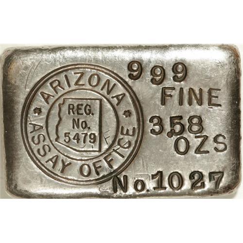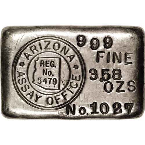 <B>Arizona Assay Office Silver Ingot.</B></I> Probably made circa 1969 for Paul Franklin by the Jack Stone, who operated the Arizona Assay Office through the 1960s. This ingot was probably made from metal mined in Arizona, a common practice for local western assayers at that time. The ingot is smooth and attractively made with a horizontal layout. The circular company imprint is on the left part of the top side. The right side reads: 999/FINE/3.58/OZS/No. 1027.<BR><BR><b>Shipping:</b> Coins & Currency (<a target="_blank" href="http://www.heritageauctions.com/common/shipping.php">view shipping information</a>)