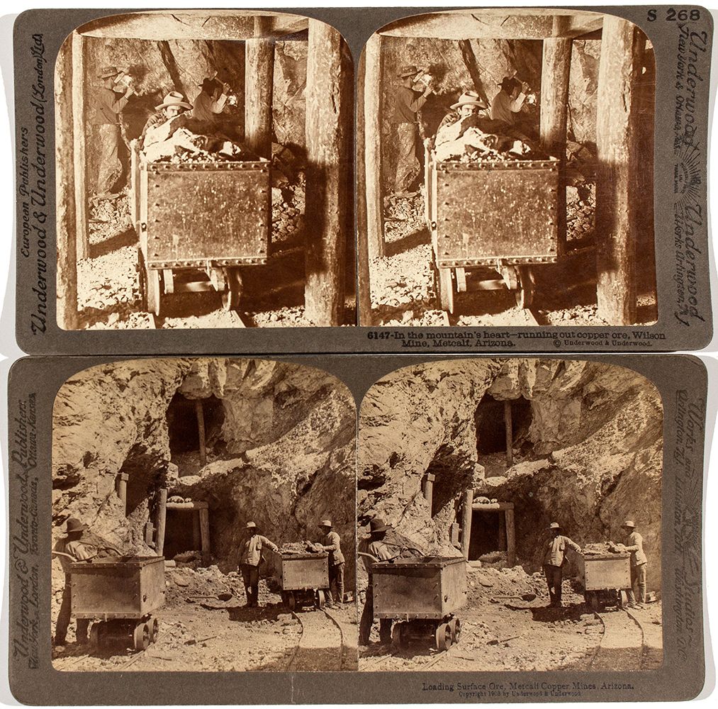 c1903 Pair of cards representing copper mining at Mt. Shannon, in the Metcalf mine and the Wilson mine. Both cards were published by "Underwood & Underwood." The first shows men loading surface ore into carts at the Metcalf. The reverse side is blank. The second, at the Wison mine, shows a man loading a laden ore cart while 2 others behind him use hammers to drill into the rock for setting dynamite. The reverse of this card offers an explaination of the location and the operations photographed. It continues about US mining and what it supplies to the rest of the world. There are even 5 captions in foreign languages. Both cards are in excellent condition, with great contrast and clarity. Bud Bassett Collection - HKA#65538