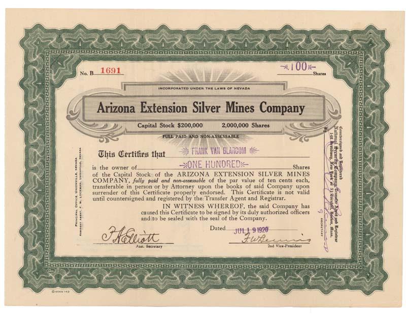 1920, Nevada. Stock certificate for 100 shares. Green/Black. Uncancelled and very fine.