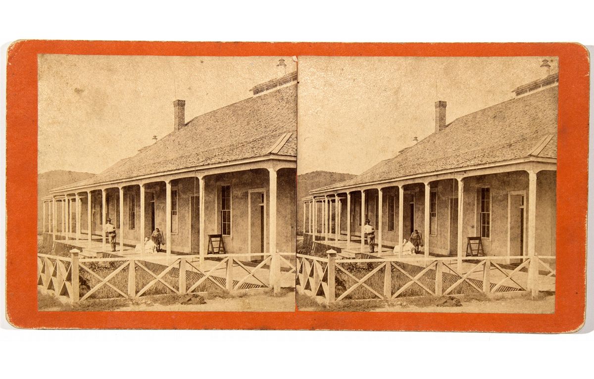 c1864 The famous Fort Whipple Hospital is depicted in the rare stereo card. The card does display age fade, with minor yellowing and a few tiny stains. Overall it is in very good condition, with good clarity. Fort Whipple was established in 1864, and was the Arizona Territory's capitol prior to the founding of Prescott. It was closed in 1913, but became a Military Hospital, used throughout WWI and WWII. Bud Bassett Collection - HKA#65572