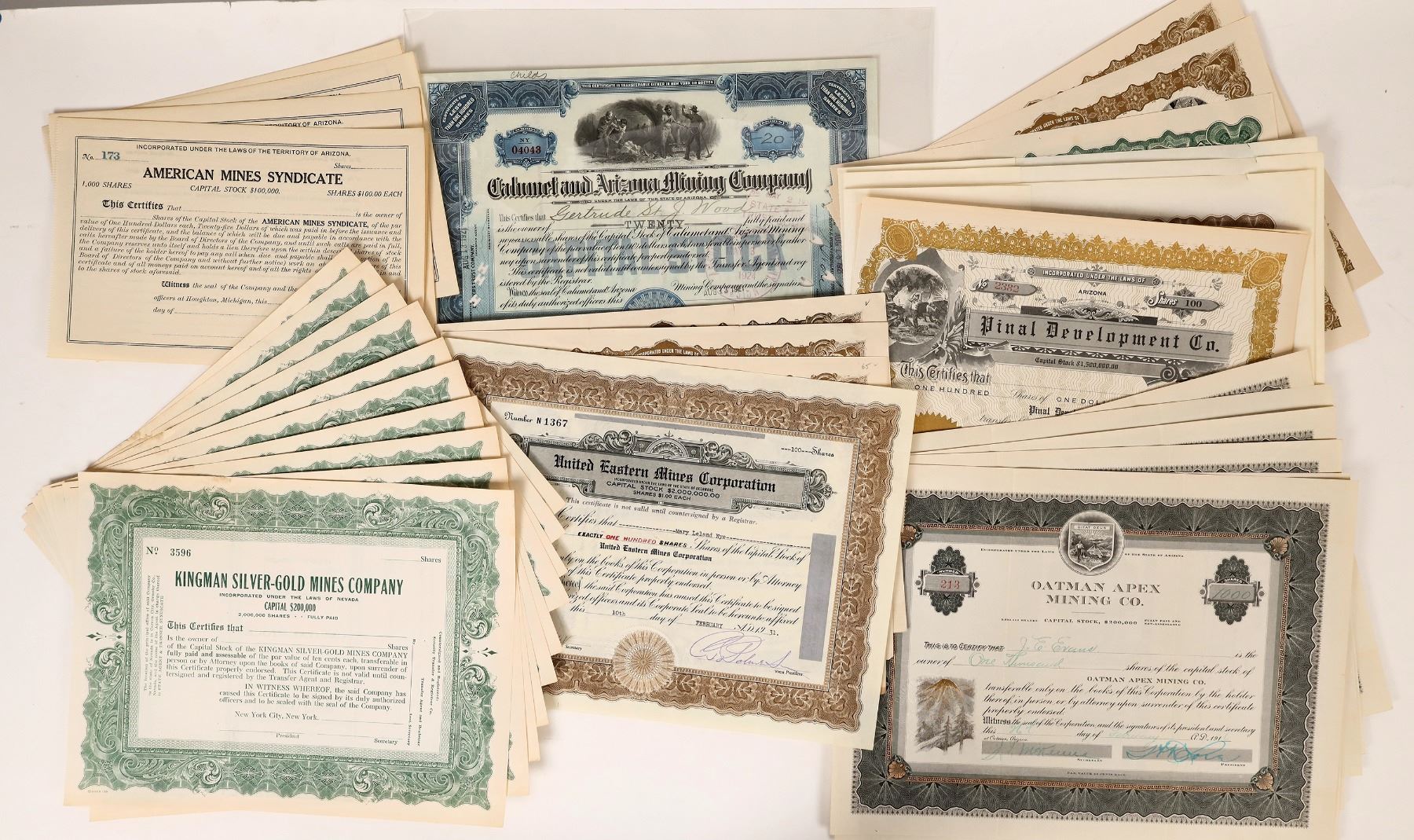 Lot of 37. Includes: Calumet & Arizona Mining Co. (1921); United Estern Mines Corp. (1931); Oatman Bonanza Gold Mines Co. (3, 1916); Oatman Apex Mining Co. (3, 1916); American Mines Syndicate (7 unused receipts); Kingman Silver-Gold Mines Co. (10 uniss.); Arizona-Mexican Mining & Smelting Co. (3, 1905-09, plus 2 uniss.); Oatman Imperial Mines Co. (1916); Mildred Gold Mines Co. (3, 1926); and Pinal Development Co. (3 uniss.).