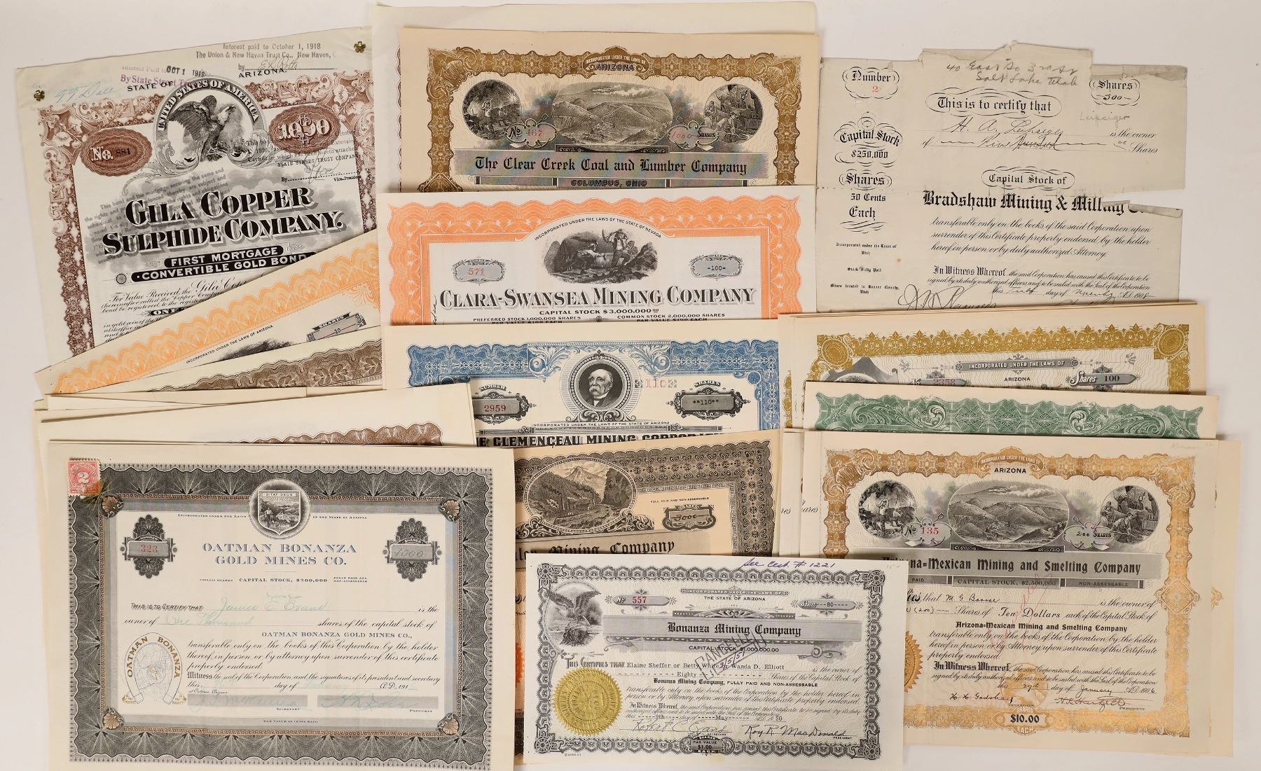 Lot of 35. Includes: Monster Chief Mining Co. (1916); Coaley Mining Co. (1913); Clear Creek Coal & Lumber Co. (1909); Gila Copper Sulphide Co. (1913 bond); Clemenceau Mining Corp. (1939); Comstock-Dexter Mines, Inc. (1935); Cordova Copper Co. (1909); Copper Chief Extension Mining & Smelting Co. (1916); Bradshaw Mining & Milling (1908); Clara-Swansea Mining Co. (1927); Mildred Gold Mines Co. (2, 1926, plus uniss.); Kingman Silver-Gold Mines Co. (10 uniss.); United Eastern Mines Corp. (2, 1931); Arizona-Mexican Mining & Smelting Co. (3, 1906 and uniss.); Copper King of Arizona (1897); Oatman Bonanza Gold Mines Co. (1916); Oatman Apex Mining Co. (1916); Bonanza Mining Co. (1949); and Pinal Development Co. (3 unissued). Please inspect.